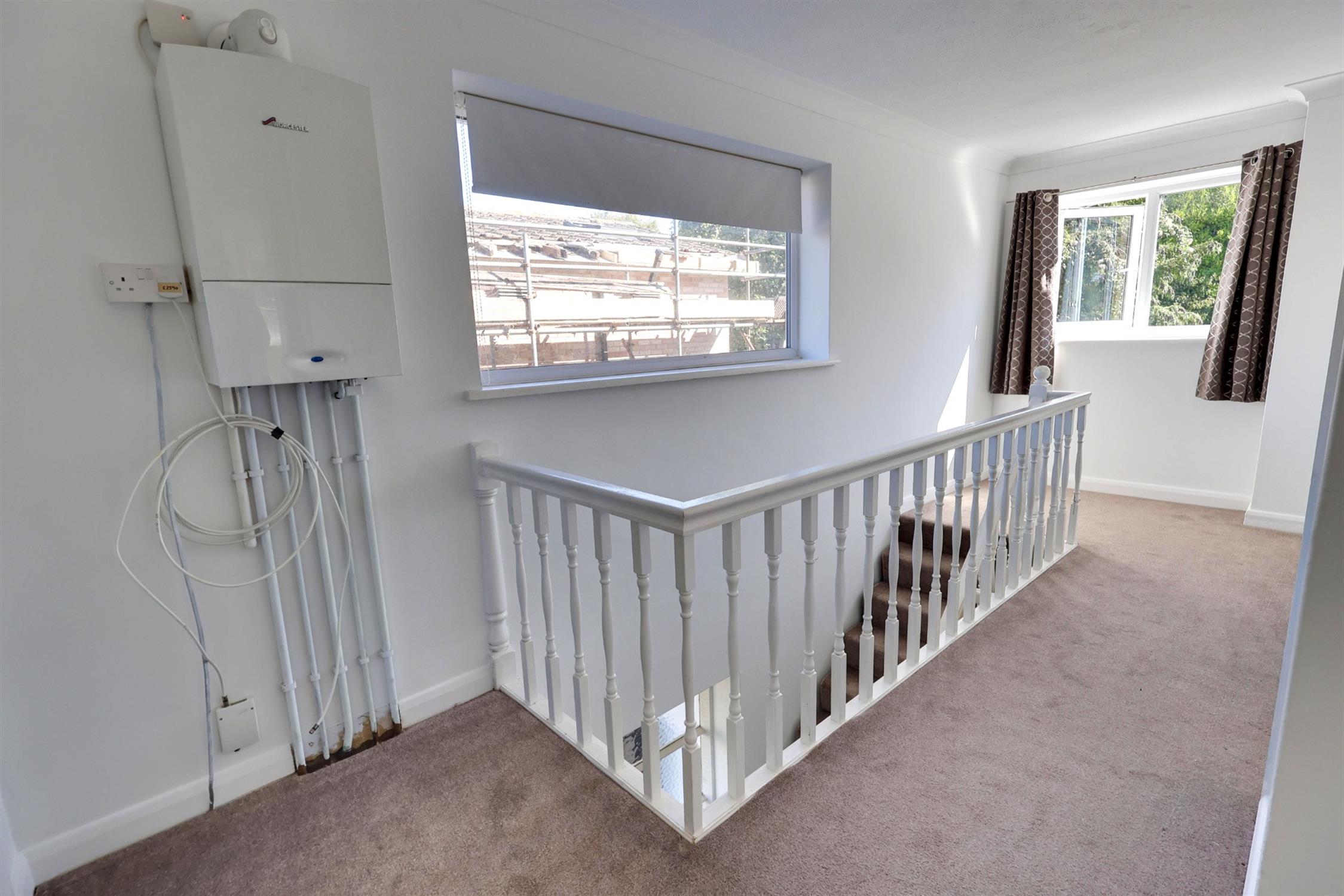 Twin aspect landing with loft access and wall mounted gas fired combination boiler. Linen cupboard.