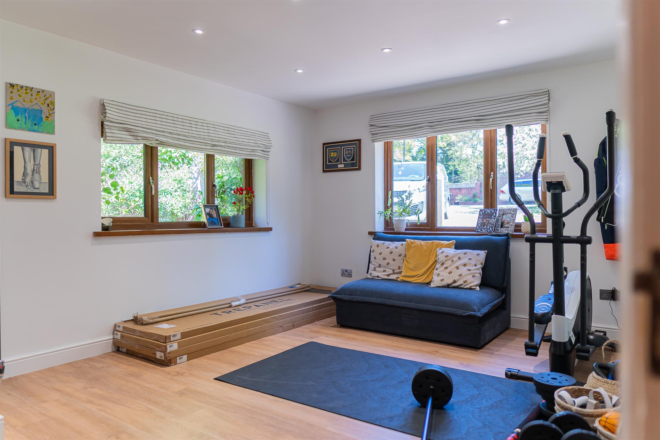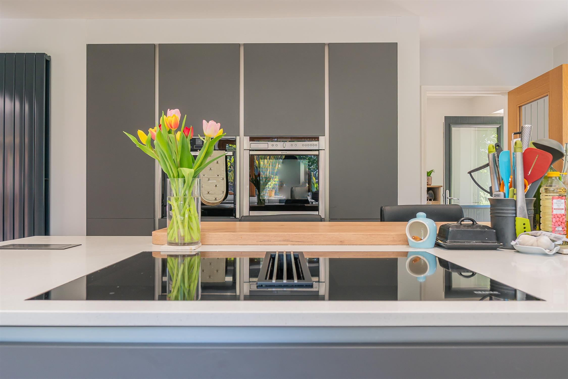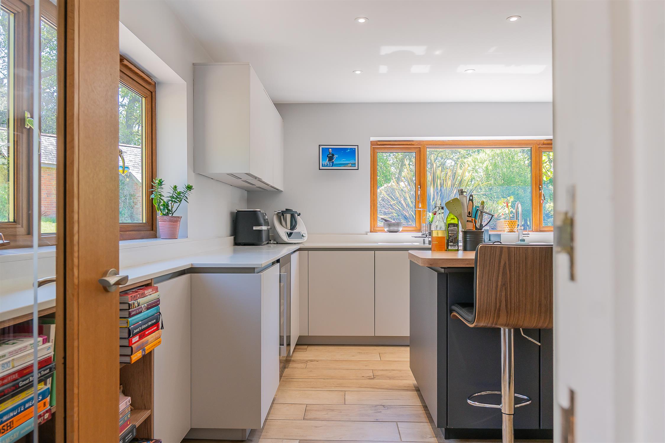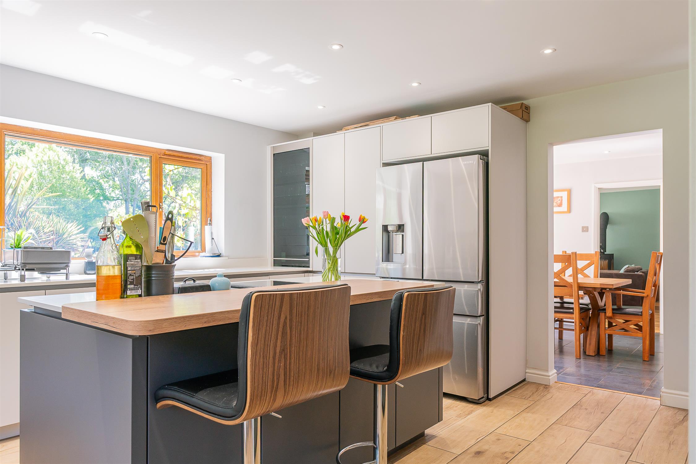 Windows to rear and side aspect. Fitted with a comprehensive range of Kutchenhaus base and wall units with central island. Inset sink with Quooker hot and sparkling water enabled tap. Integrated Miele app enabled dishwasher. Integrated wine fridge. Roller shutter door storage cupboard. Two eye level Neff built in ovens. The central island has an inset induction hob with draw down extractor. American style fridge freezer included. Larder cupboard housing space for coffee machine. Wood effect tiled flooring. Underfloor heating.