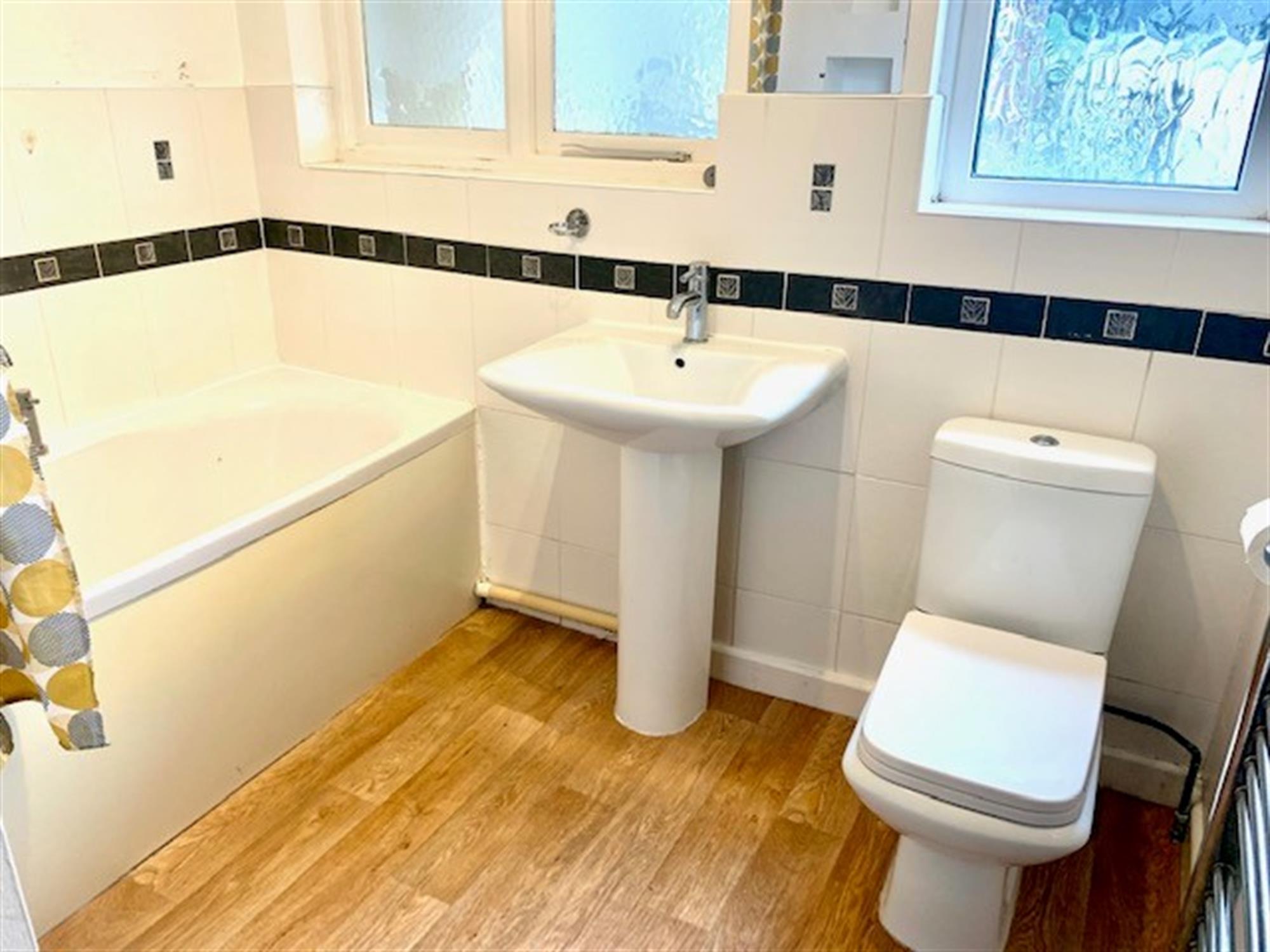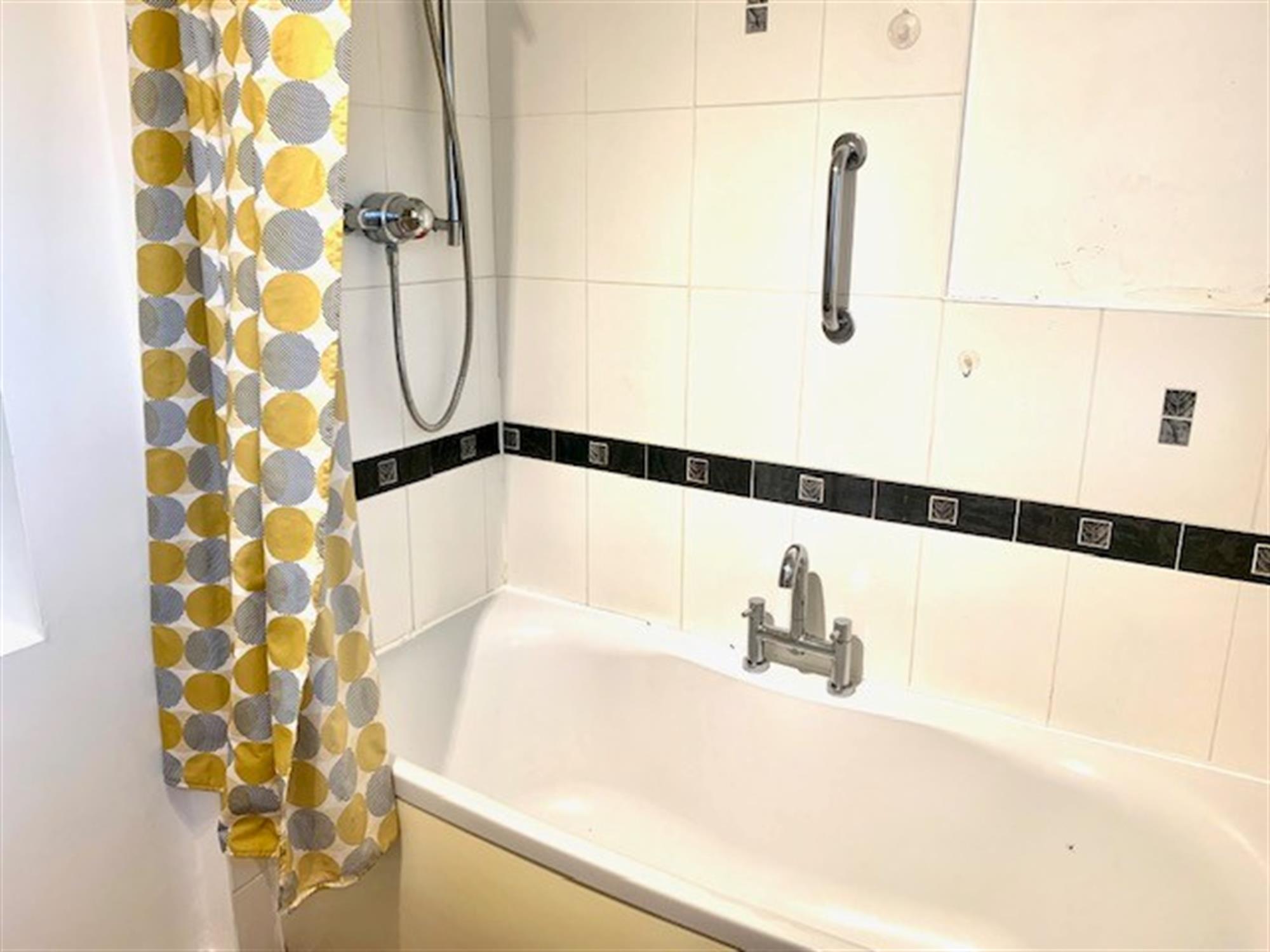 GROUND FLOOR BATHROOM - White suite with bath with shower over, sink and toilet.