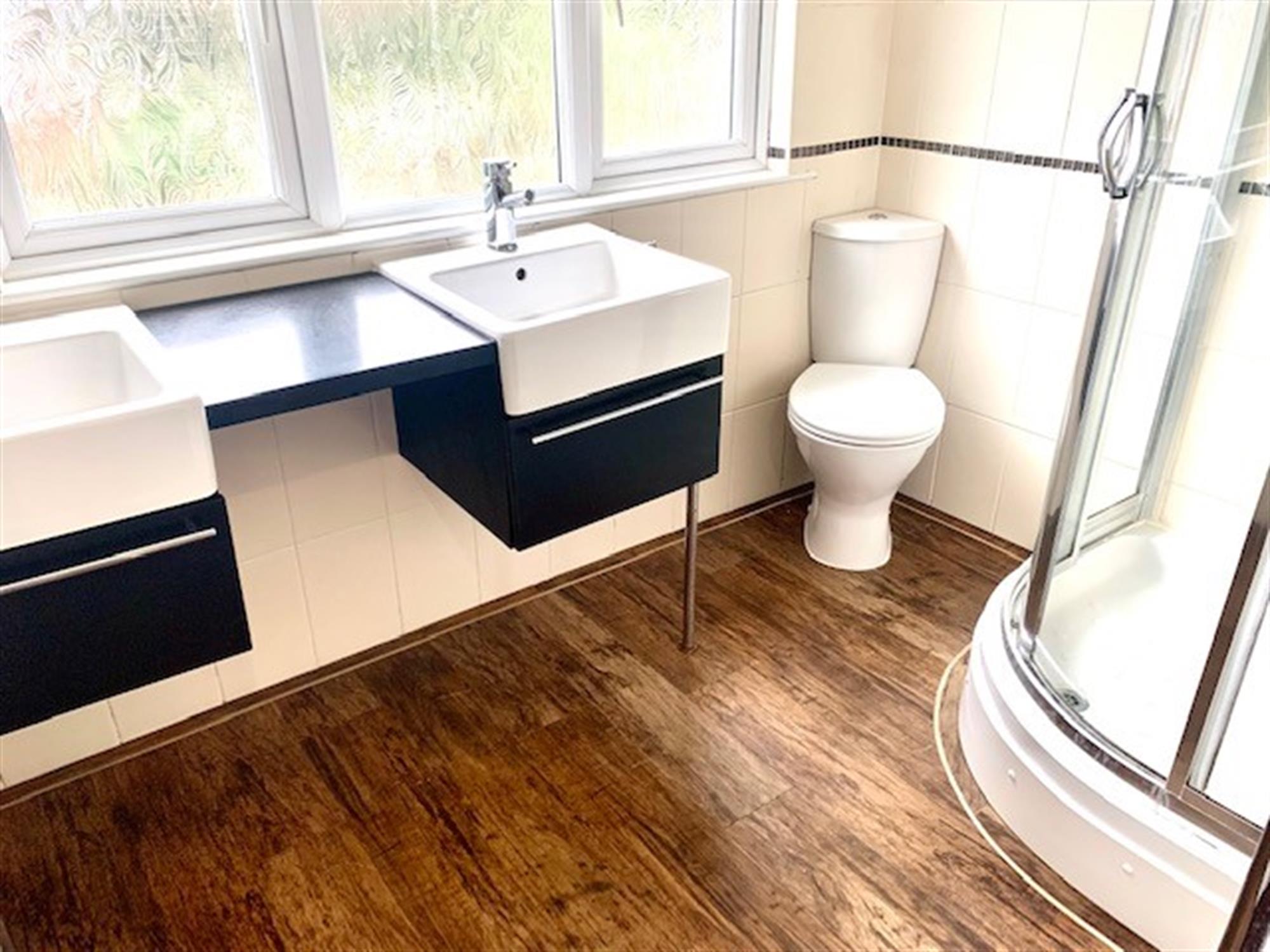 ENSUITE - Corner shower, double sink unit and toilet. Window to side.