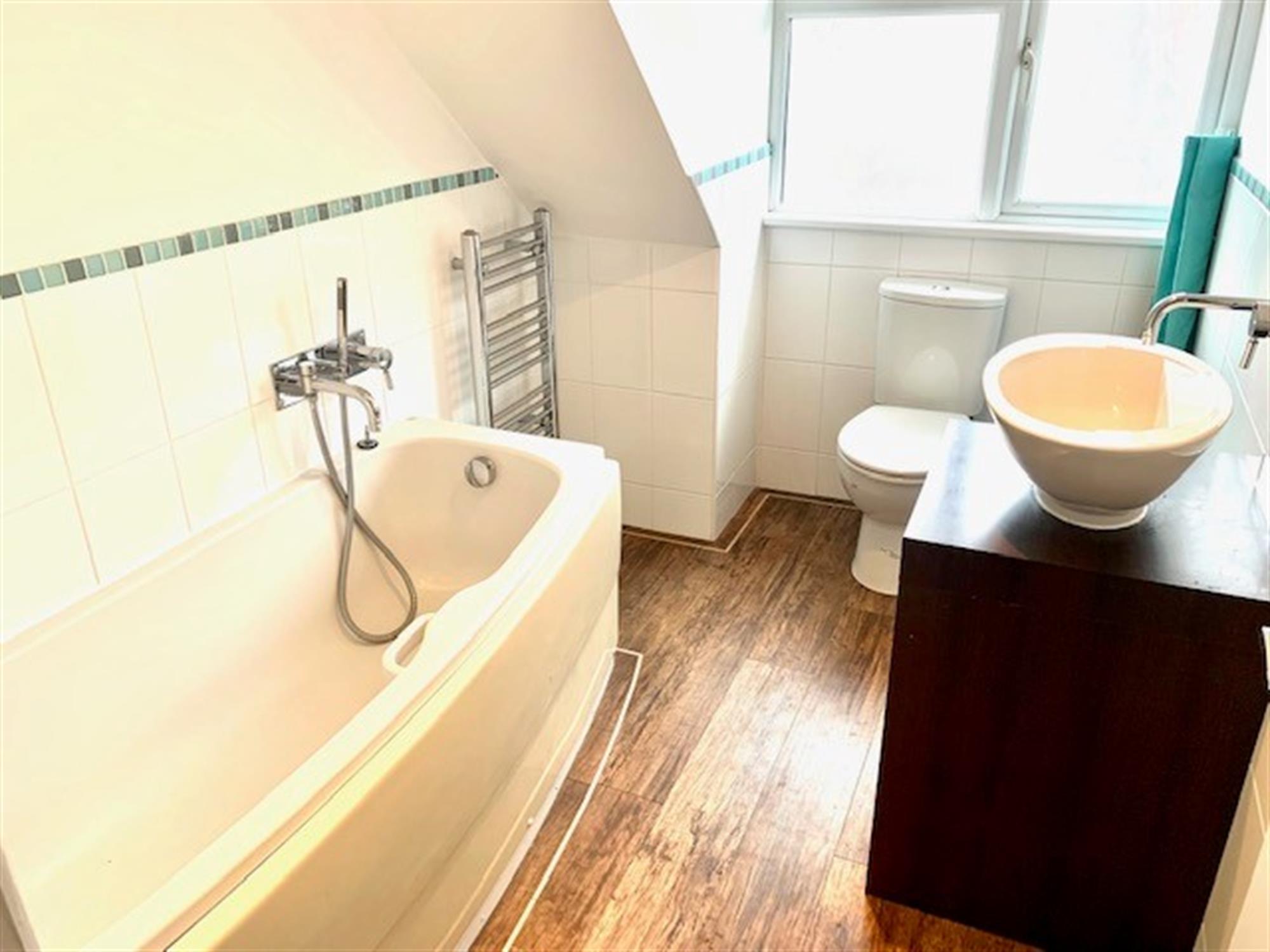 FIRST FLOOR BATHROOM - Bath with hand held shower attachment. Sink set in vanity unit and toilet. Window to side.