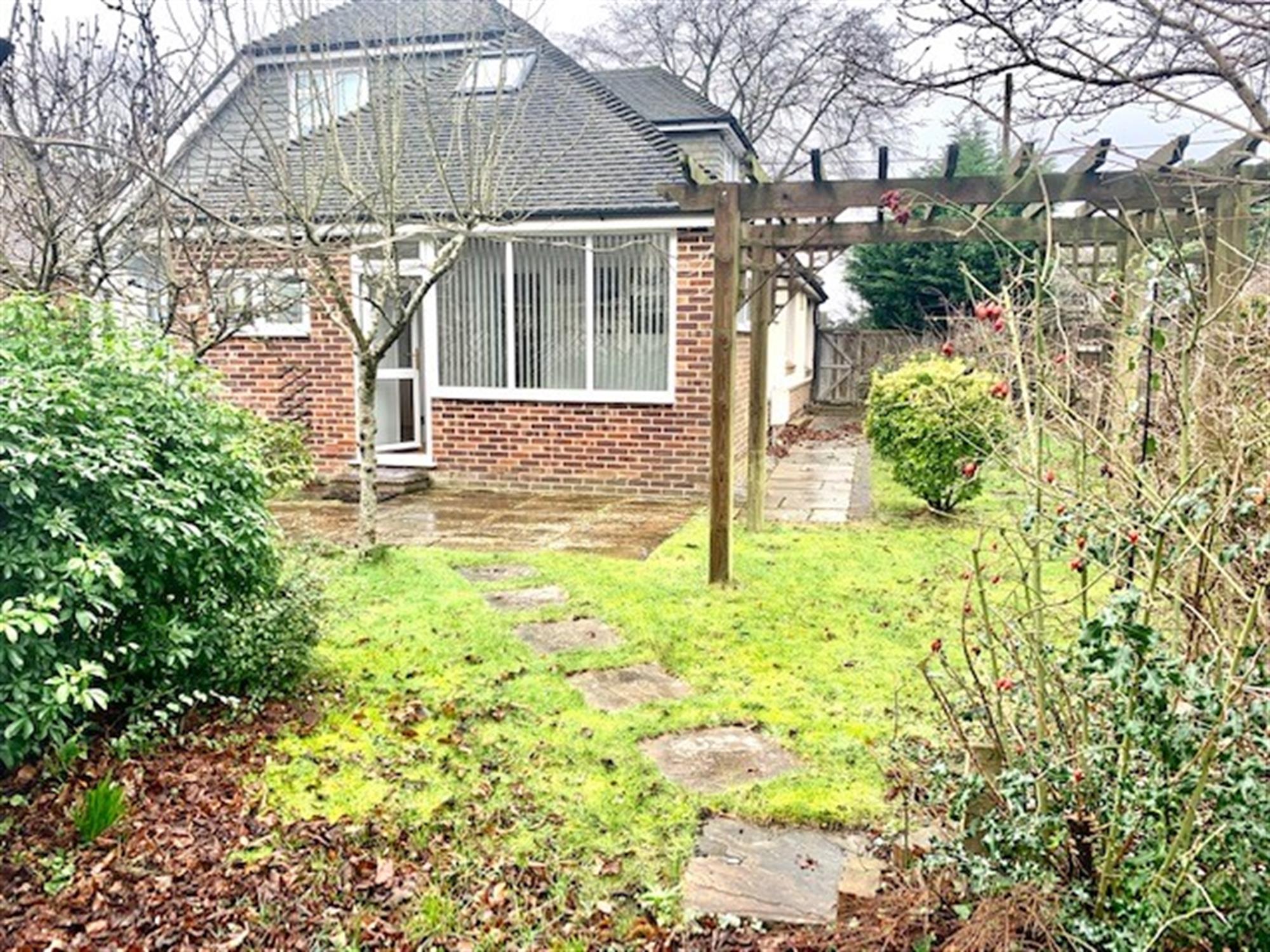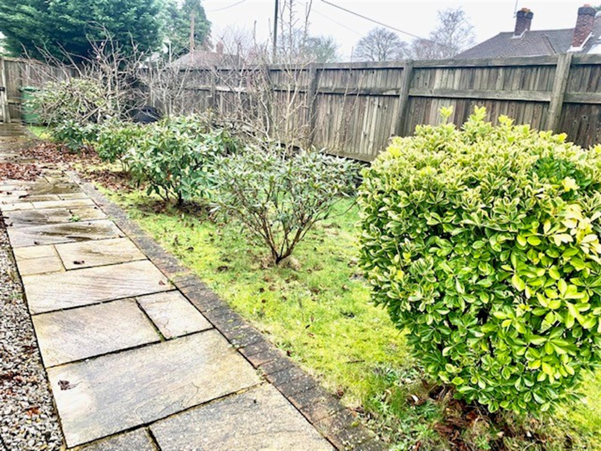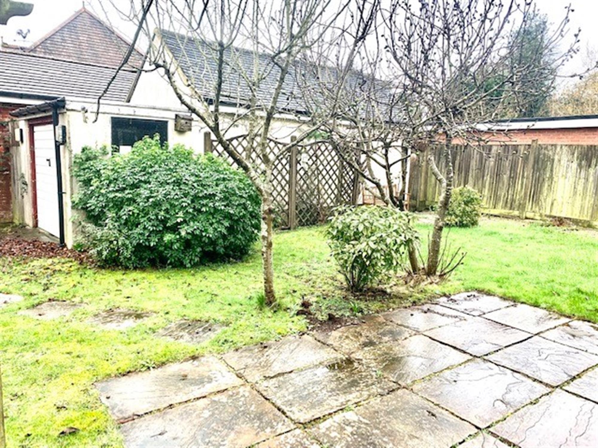 EXTERIOR REAR - Gate to side with driveway leading to garage. Laid to lawn with shrub beds. Garage has been extended so larger than normal.