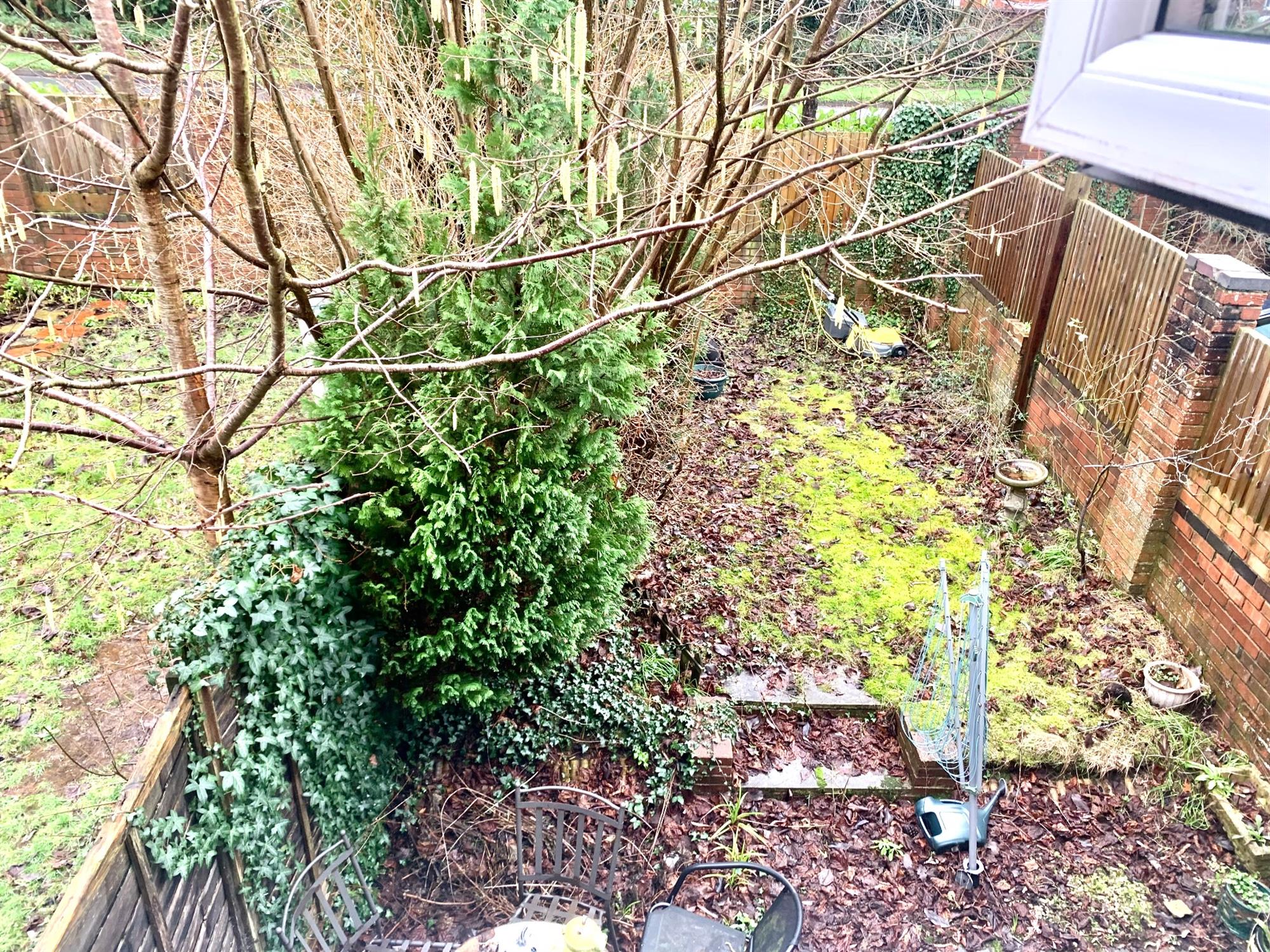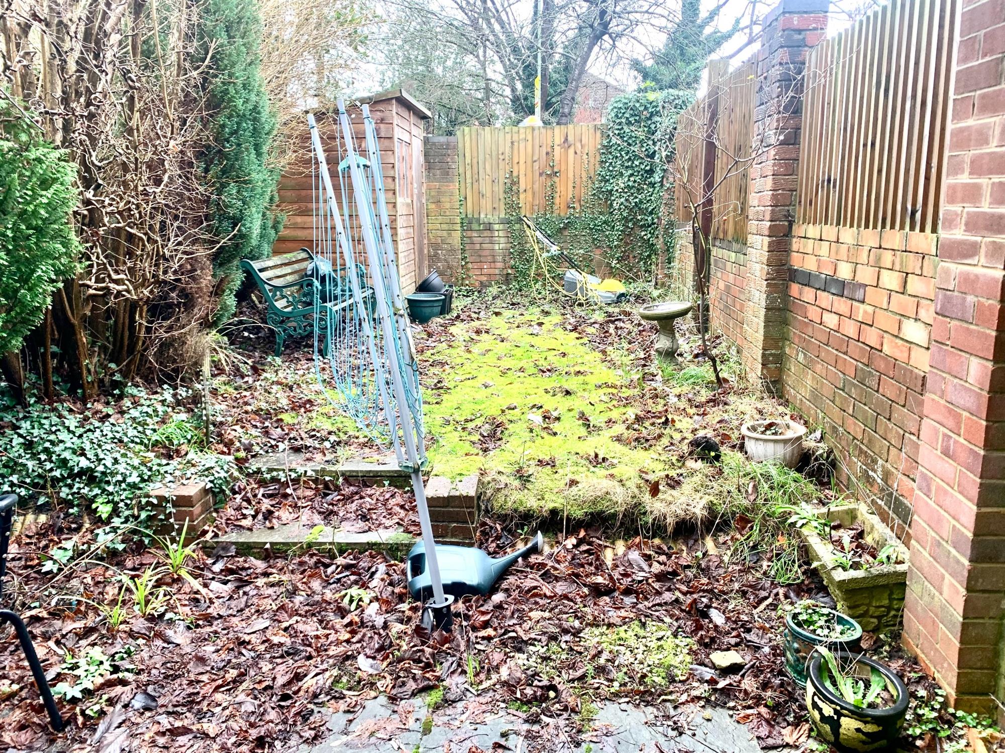 REAR GARDEN – Patio area with small grass area with handy storage shed and gate to side.
