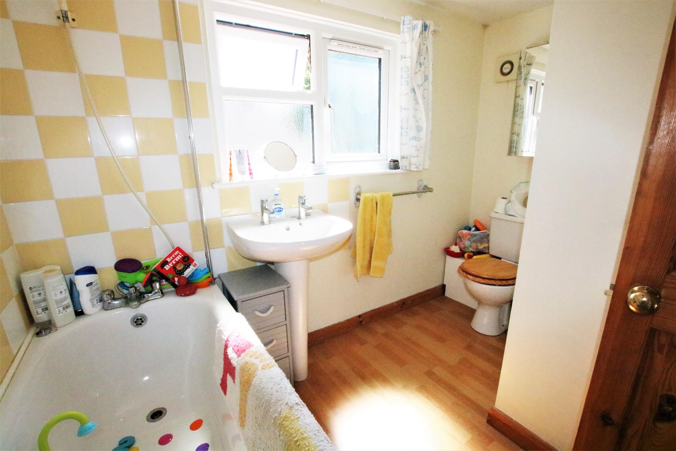 Panel enclosed bath with mixer tap and shower attachment with glazed screen. Low level W.C. Pedestal wash hand basin. double-glazed window to the side aspect. Extractor fan. Partly tiled walls.
