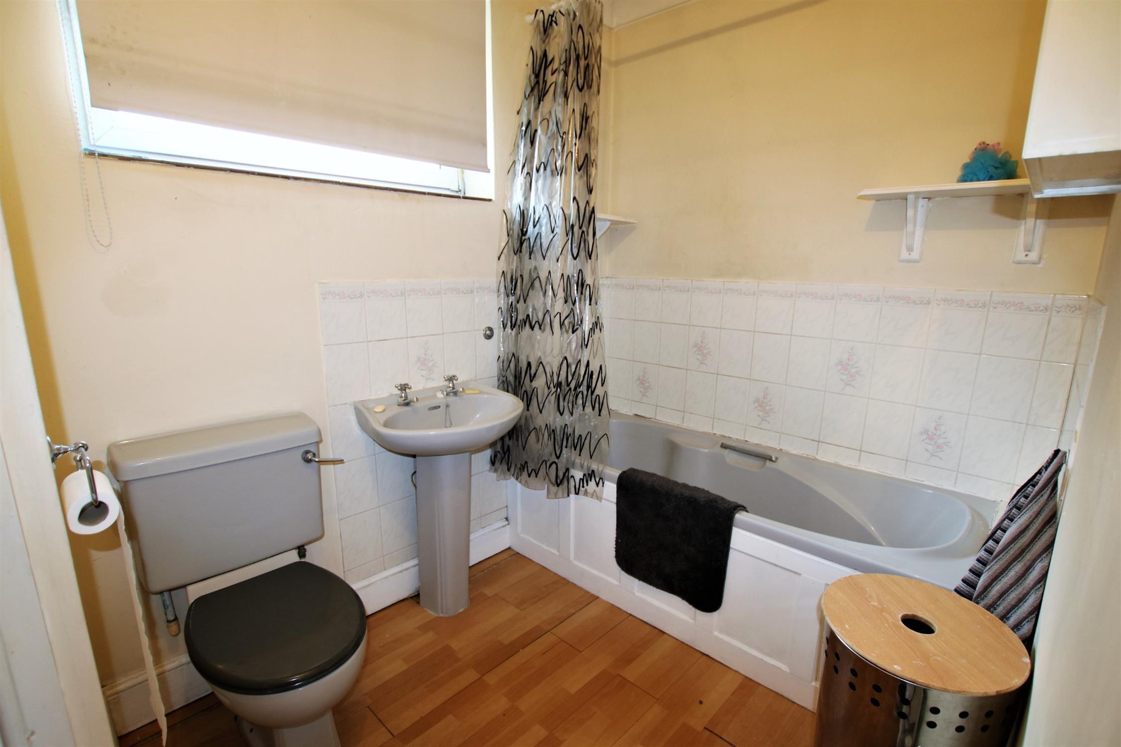 Panel enclosed bath, pedestal wash basin and low-level WC. Timber effect laminated flooring, tiled splashbacks, uPVC double glazed window to the rear aspect, built-in cupboard housing boiler and water cylinder.