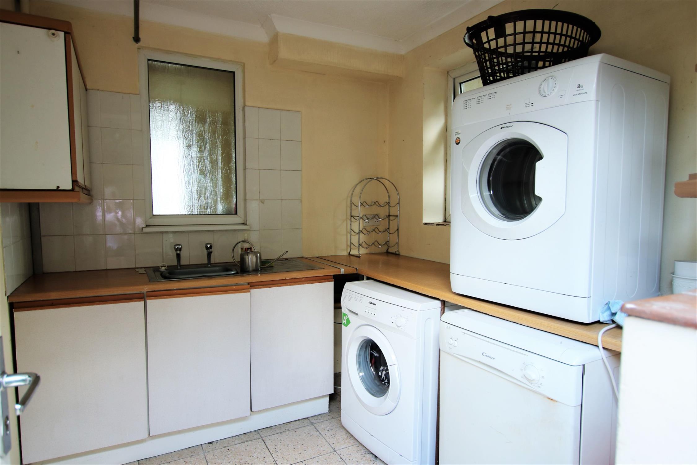 Accessed from outside, range of base level units with roll edge work surface over, stainless steel sink, space and plumbing for washing machine and tumble dryer, uPVC double glazed windows to side and rear aspects, ceramic tiled flooring, uPVC door to rear, personal door into the garage.