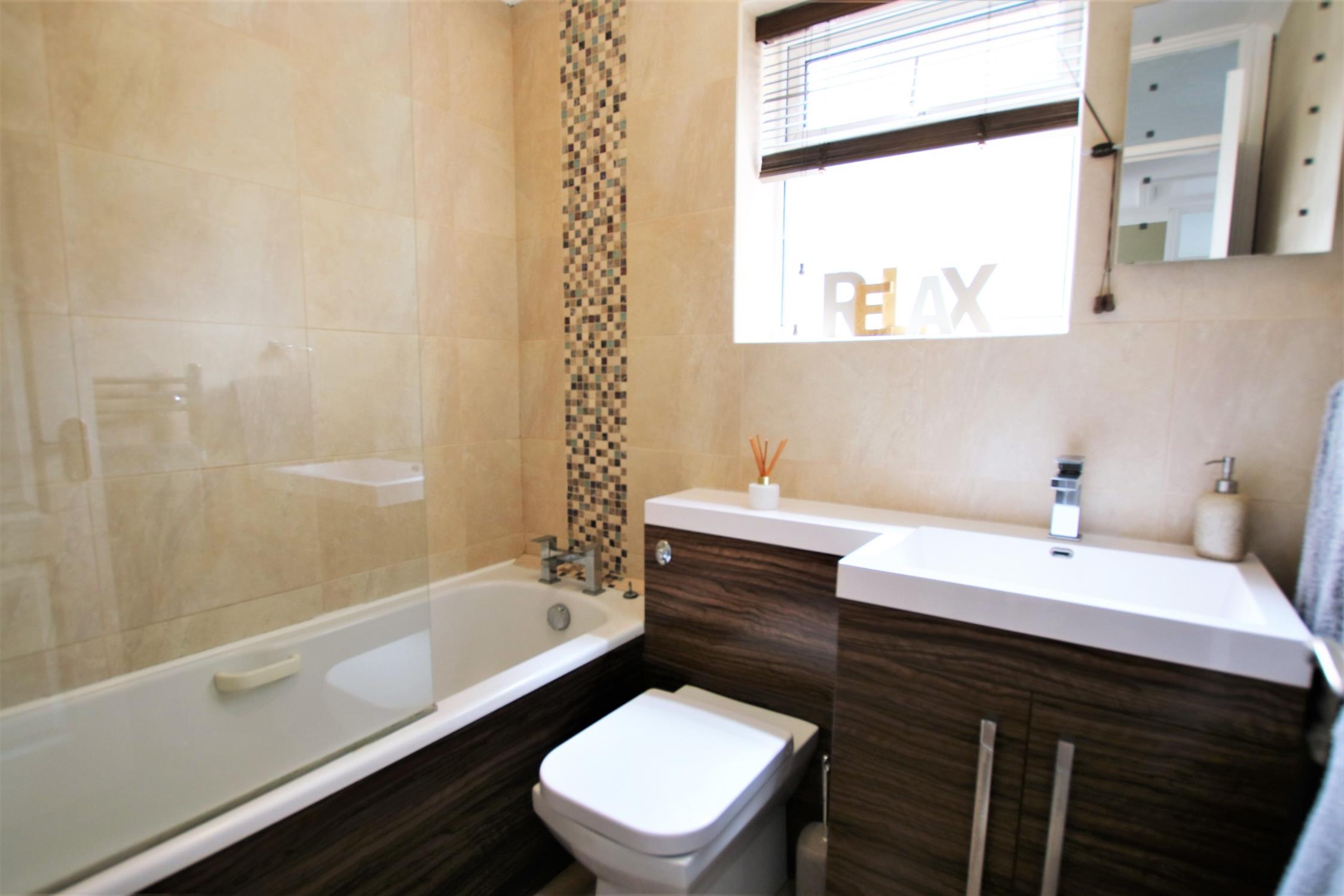 Smooth plaster ceiling, obscure double-glazed window to side aspect, floor to ceiling tiling, suite comprising: panel enclosed bath with shower over, vanity wash hand basin, low level WC and a chrome heated towel rail, vinyl flooring.