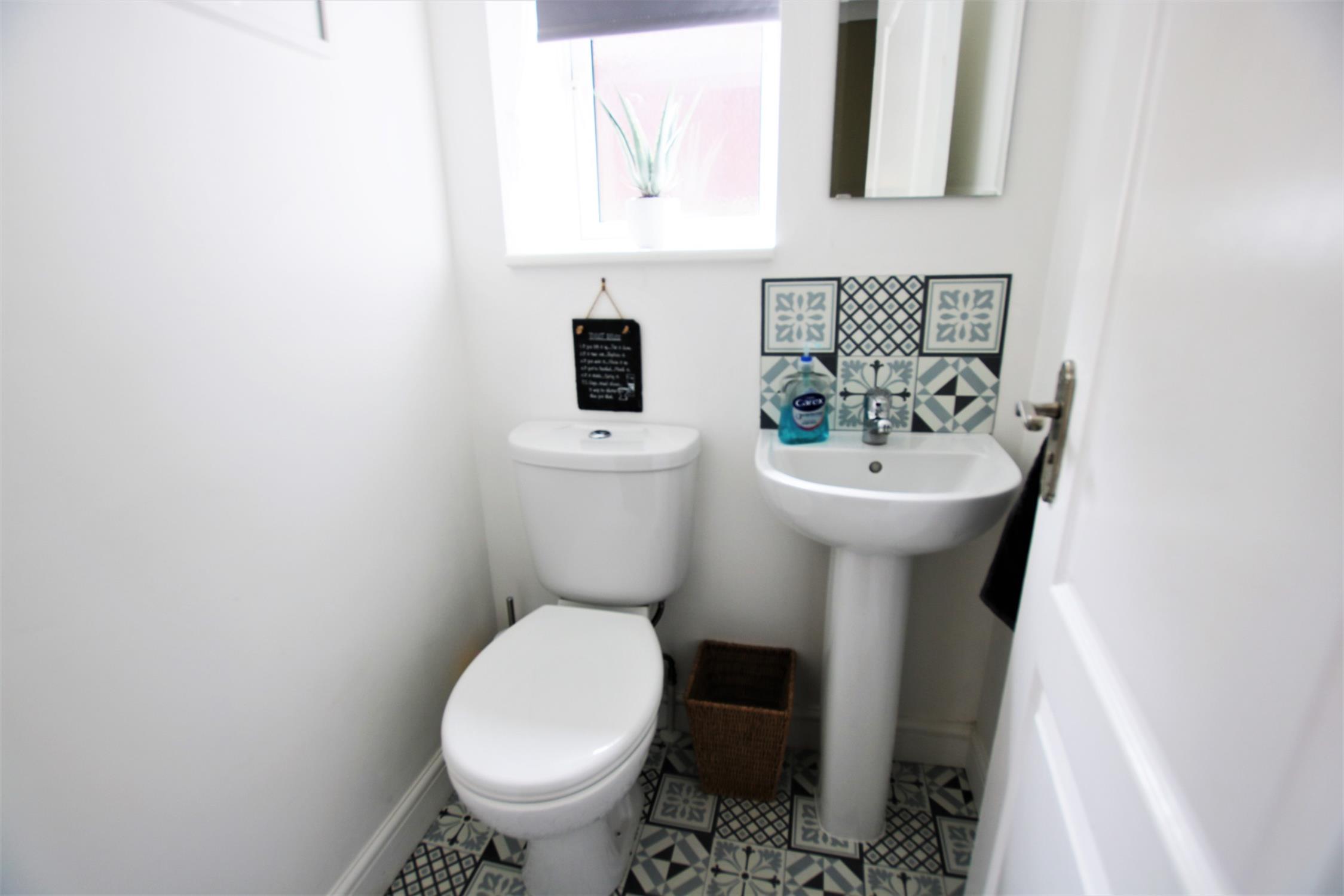 Coved to smooth plaster ceiling, obscure double-glazed window to side aspect, tiling to principal areas, pedestal wash hand basin and low level WC, tiled affect vinyl flooring.