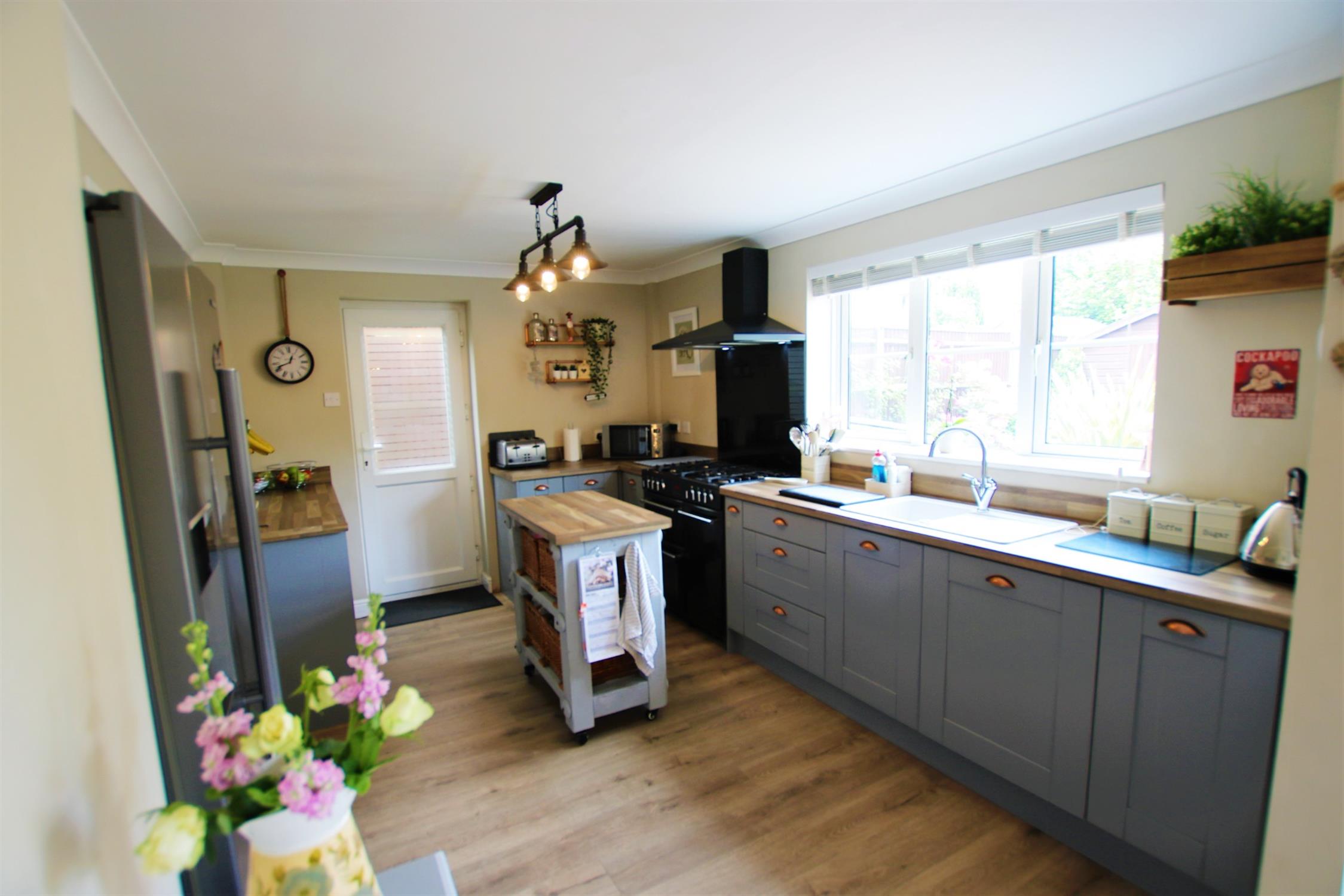 Coved to smooth plaster ceiling, double-glazed window to side aspect, tiling to principal areas, radiator, fitted with a range of matching wall and base level units with contrasting worktops, stainless steel sink and drainer with swan neck mixer tap over, there is space and plumbing for an automatic washing machine and tumble dryer, wood effect flooring.