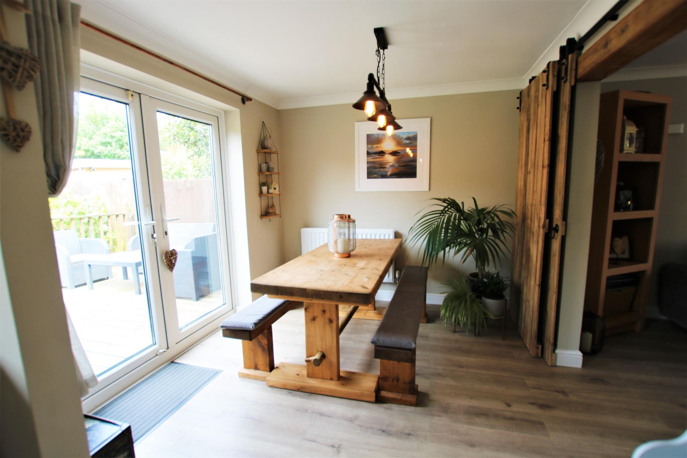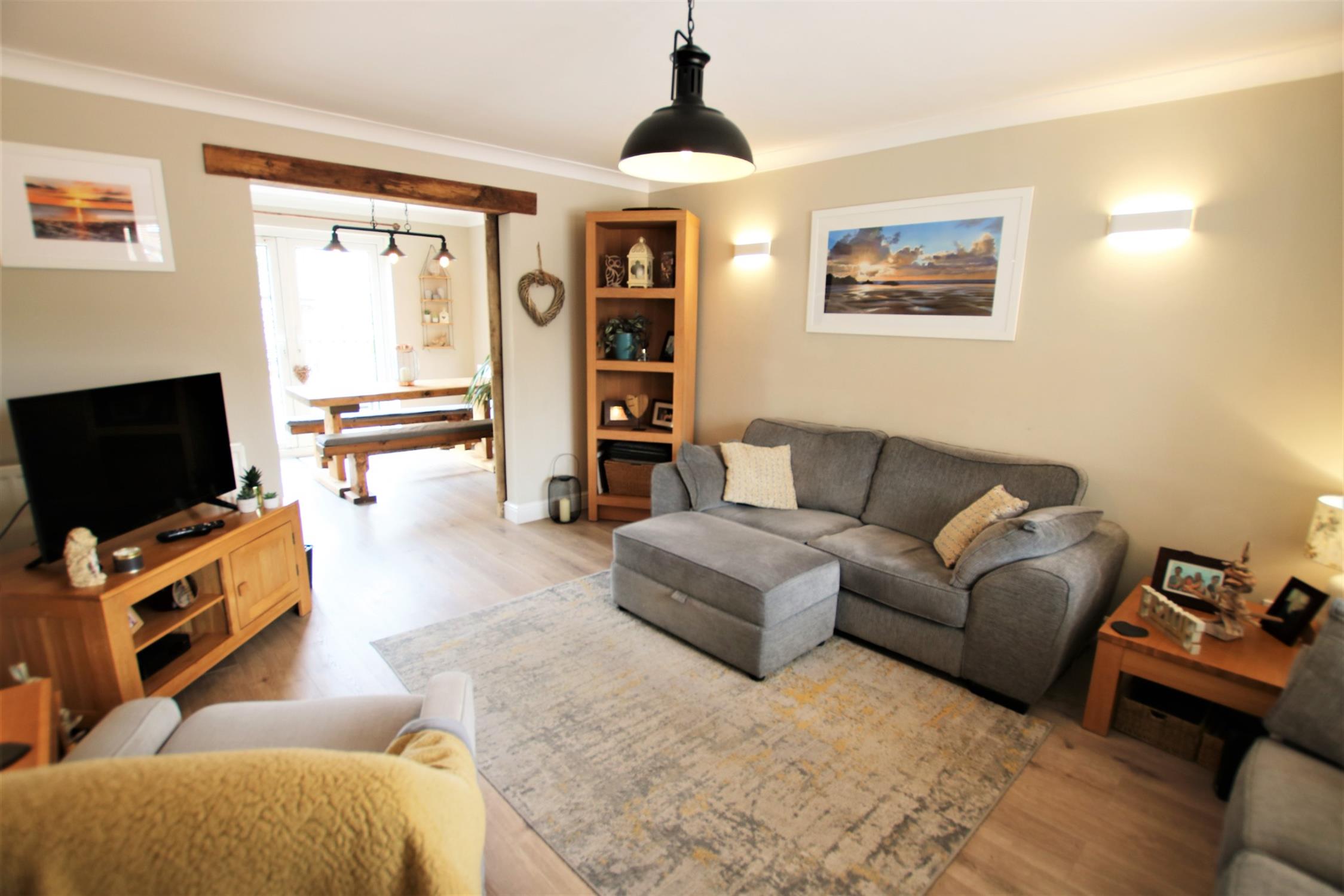 Coved to smooth plaster ceiling, double-glazed bay window to front aspect, delightful wood sliding doors leading to the kitchen/dining room, radiator, television and various power points, wood effect flooring.