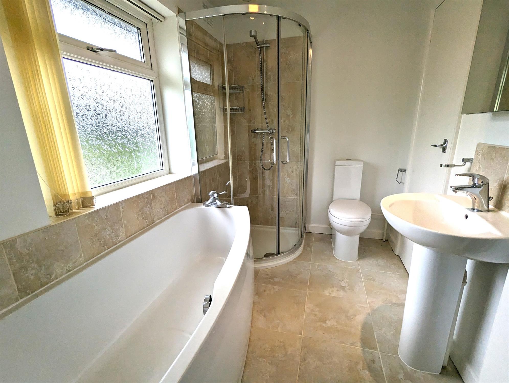 Panel enclosed bath, glazed shower enclosure, wall mounted wash basin, low level WC, ceramic tiled flooring, tiled splash backs, uPVC double-glazed window to the rear aspect, Shaver point, chrome heated towel rail / radiator, cupboard housing water cylinder and boiler.