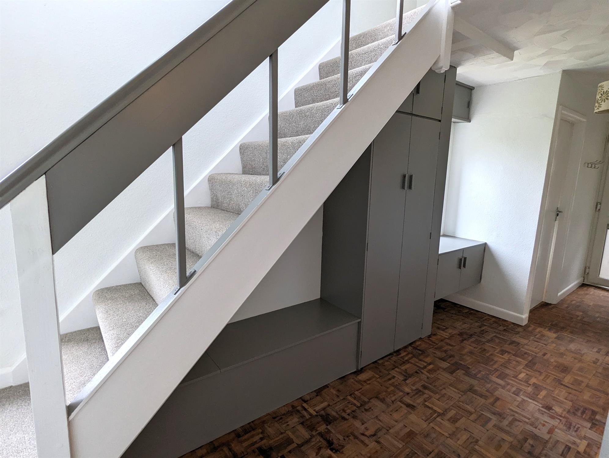 Parquet timber flooring, stairs rising to the first floor, uPVC double-glazed windows to the rear, radiator, BT telephone points, range of fitted cupboards and shelves, doors to: