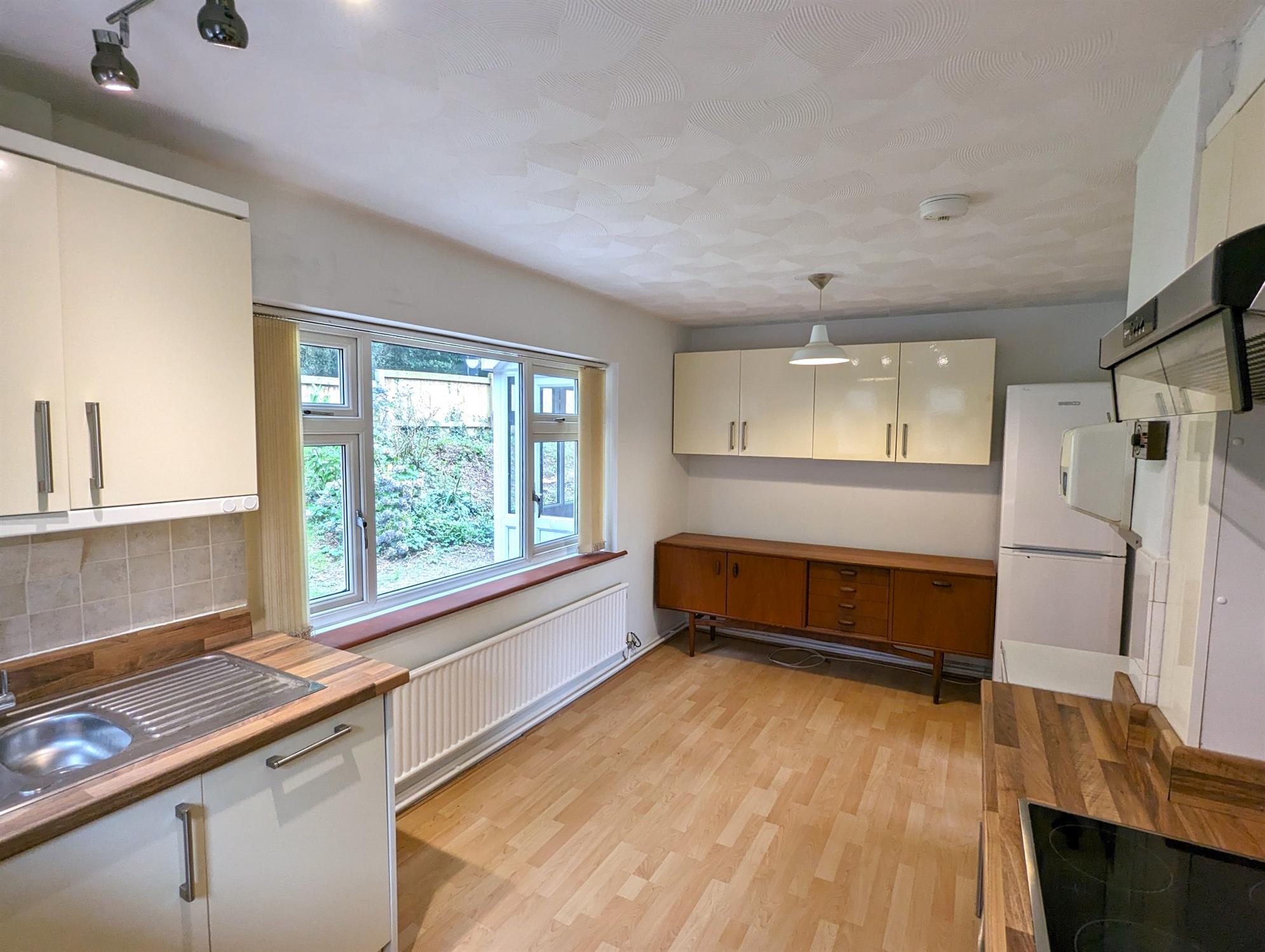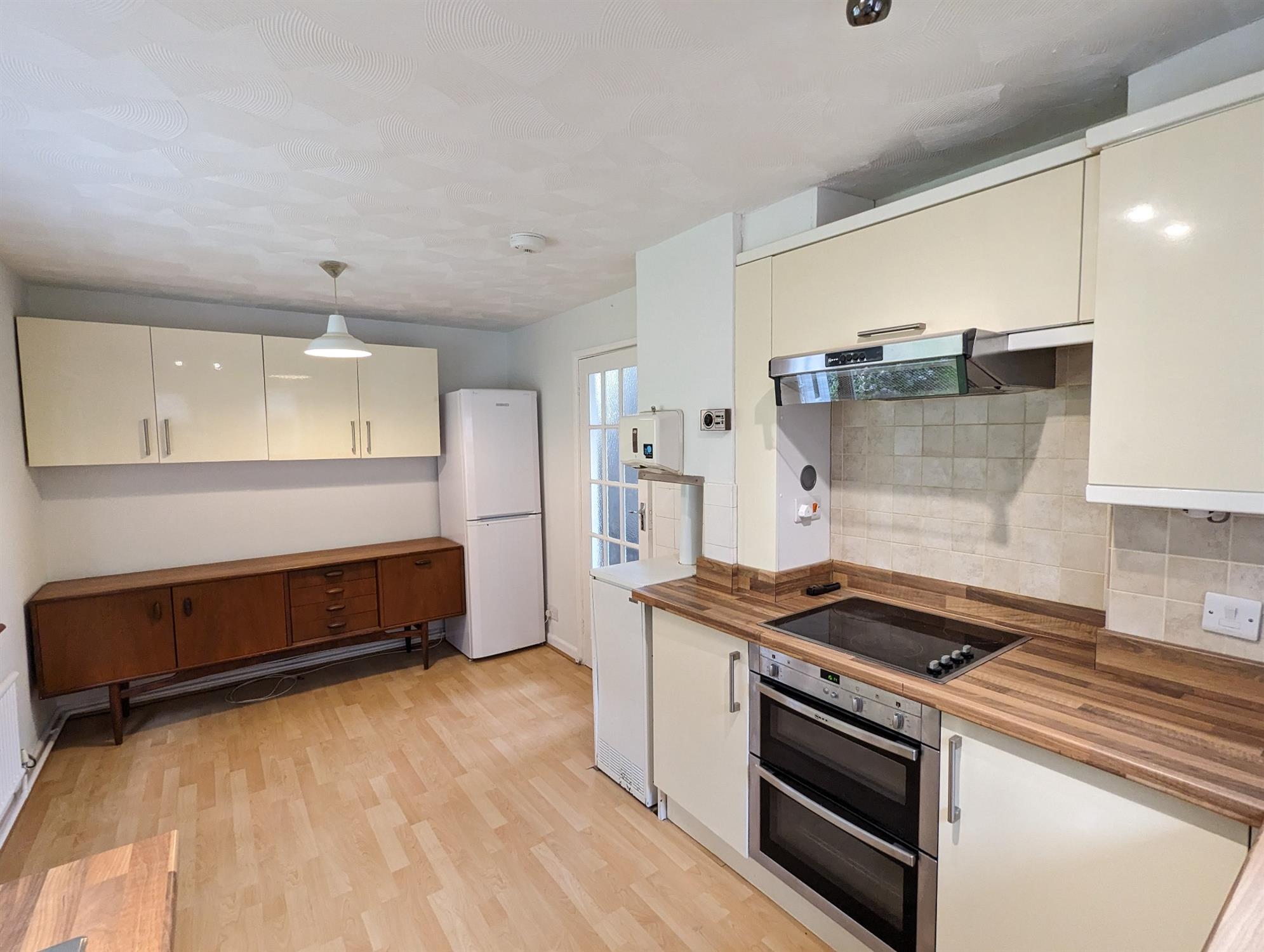 A good range of Ivory coloured eye and base level cupboards and drawers with timber block roll edged work surfaces, one and a half bowl stainless steel sink, built in Neff double oven with complimenting ceramic 4 bring hob over with extraction hood above, fitted Neff dishwasher, timber effect laminated flooring, two uPVC double-glazed windows to the side aspect, front aspect large uPVC double-glazed window, floor mounted Ideal Standard boiler, radiator, further range of eye level cupboards, radiator, space for fridge freezer.