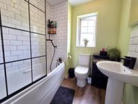 BATHROOM 6' 7" (2.01m) x 6' 4" (1.93m)Panel enclosed bath with shower above with glazed shower screen, pedestal wash basin, low level WC, double-glazed window to rear aspect, radiator, ceramic tiled flooring, decorative timber effect laminated flooring, ceramic tiled splashbacks, vertical feature column radiator.