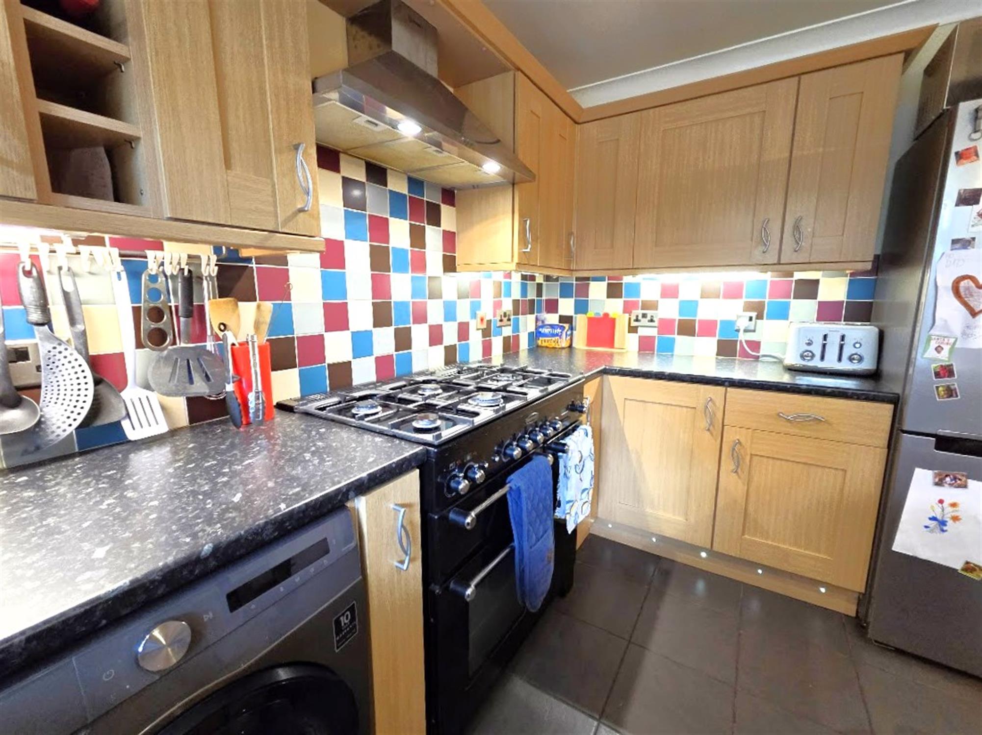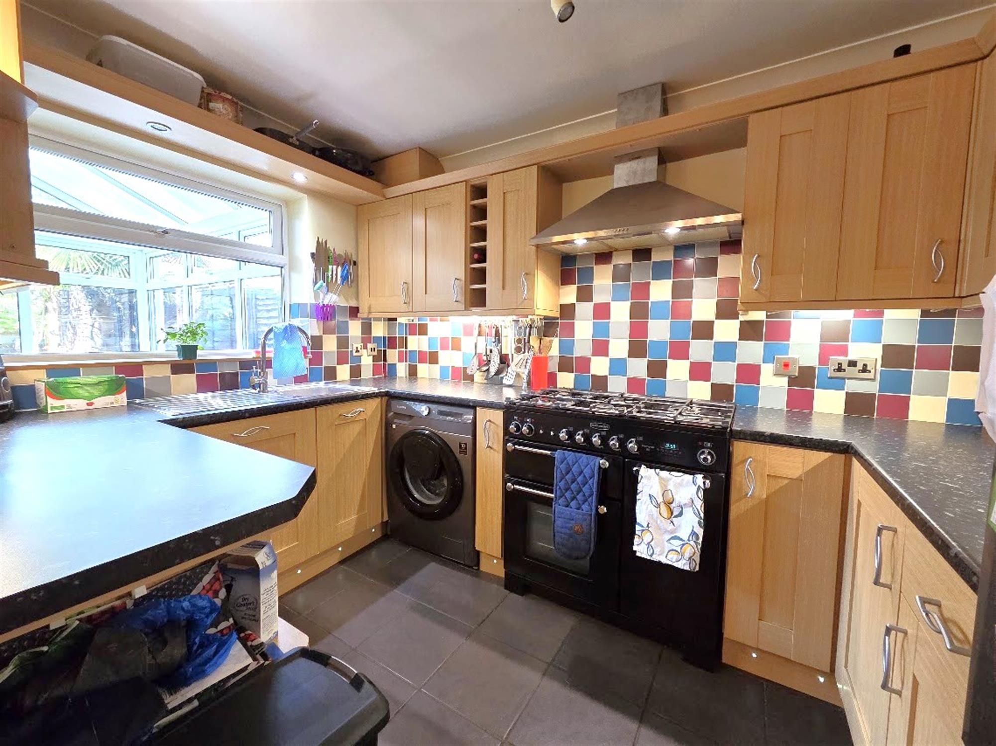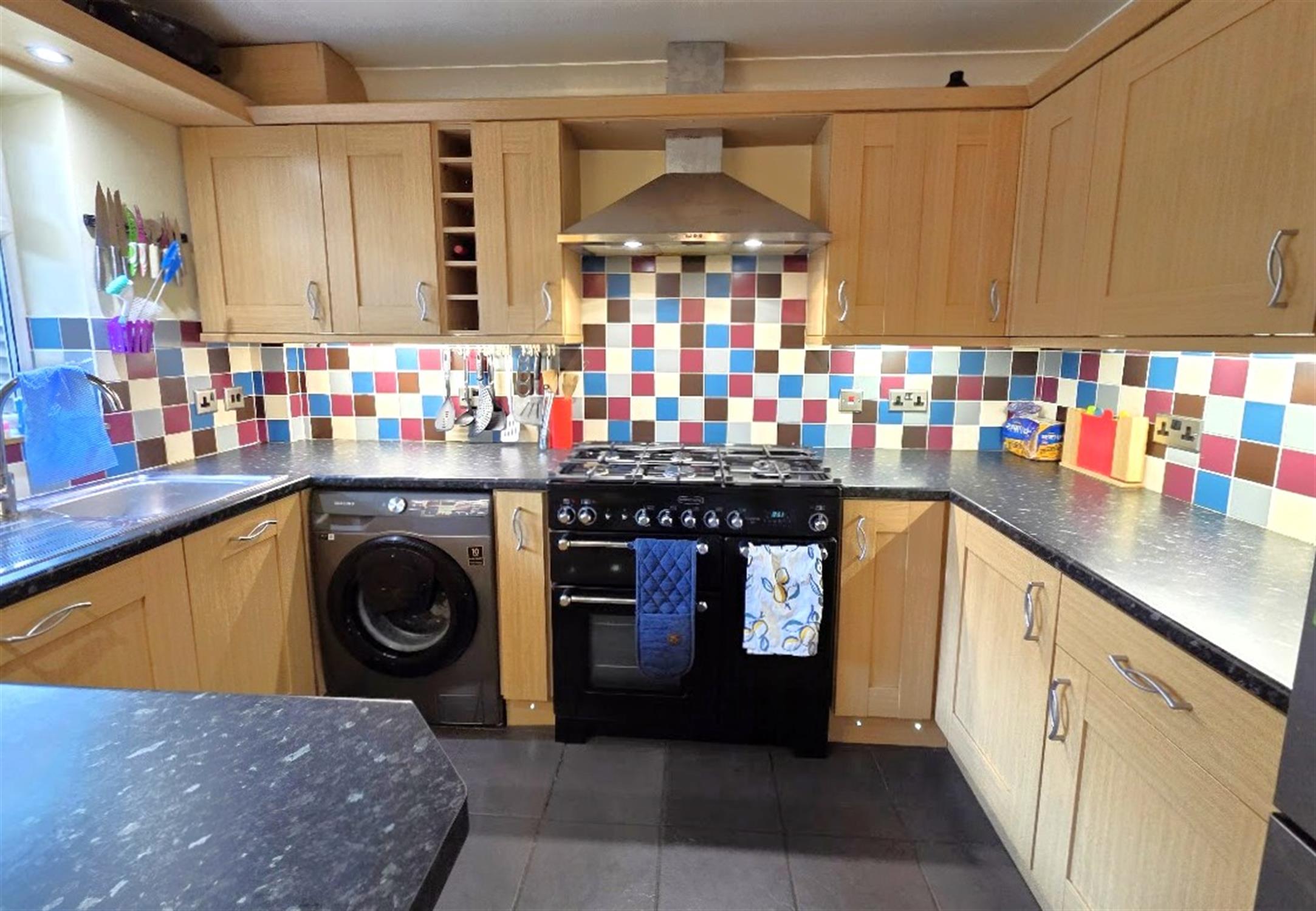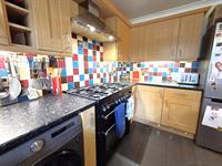 KITCHEN 10' 4" (3.15m) x 7' 3" (2.21m)Range of oak effect eye and base units with roll-edge work surfacing, tiled splash backs, space for a range-sized oven with extractor hood above, stainless steel one-and-a half bowl sink with mixer tap over, space and plumbing for automatic washing machine, space - recess for upright fridge - freezer, double-glazed window to rear aspect, ceramic tiled flooring.