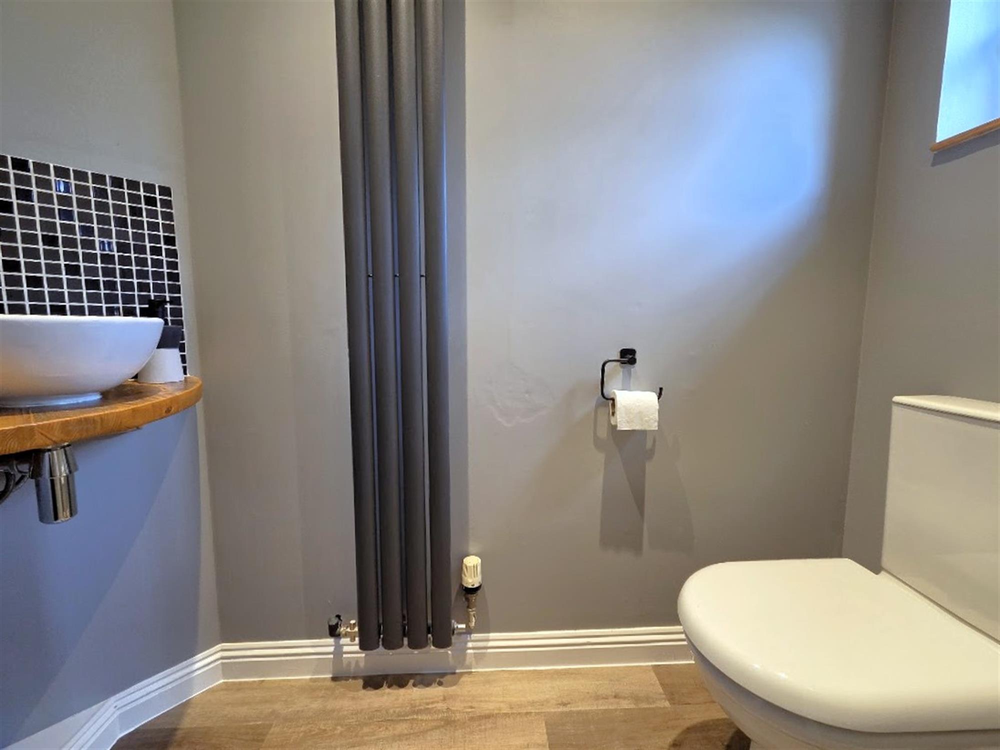 WC 6' 4" (1.93m) x 2' 9" (0.84m)Low-level WC, wall-mounted basin, with a mosaic tiled splashback, double-glazed window to the front aspect, laminated flooring, vertical feature column radiator.