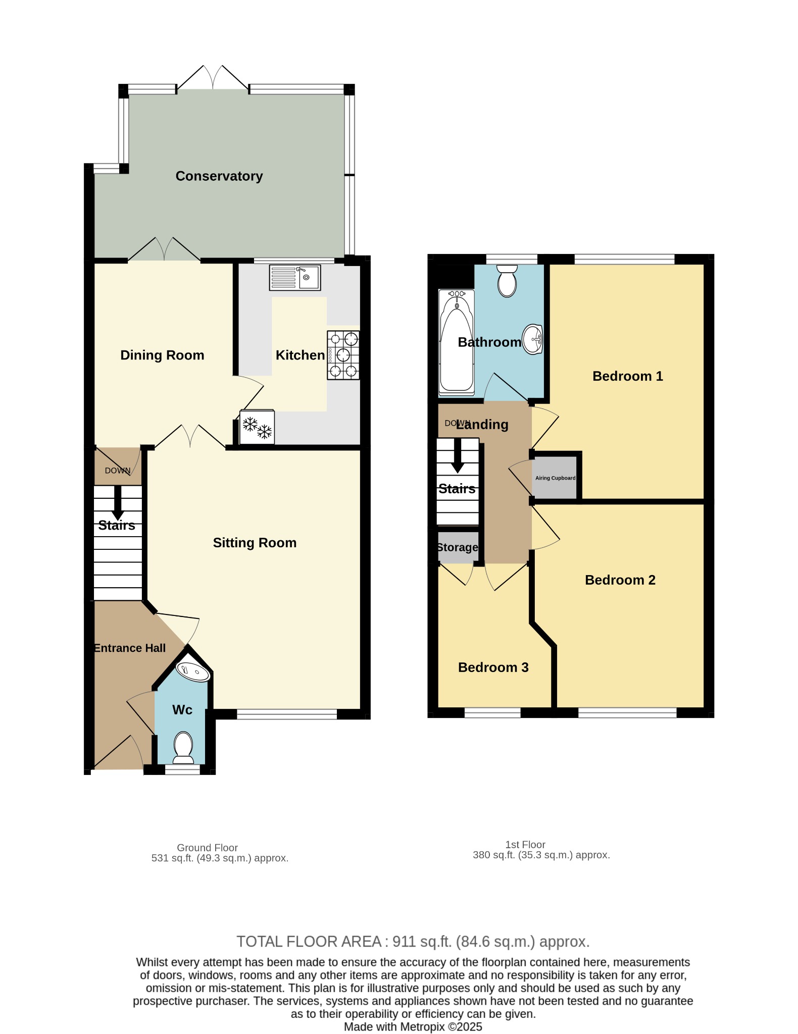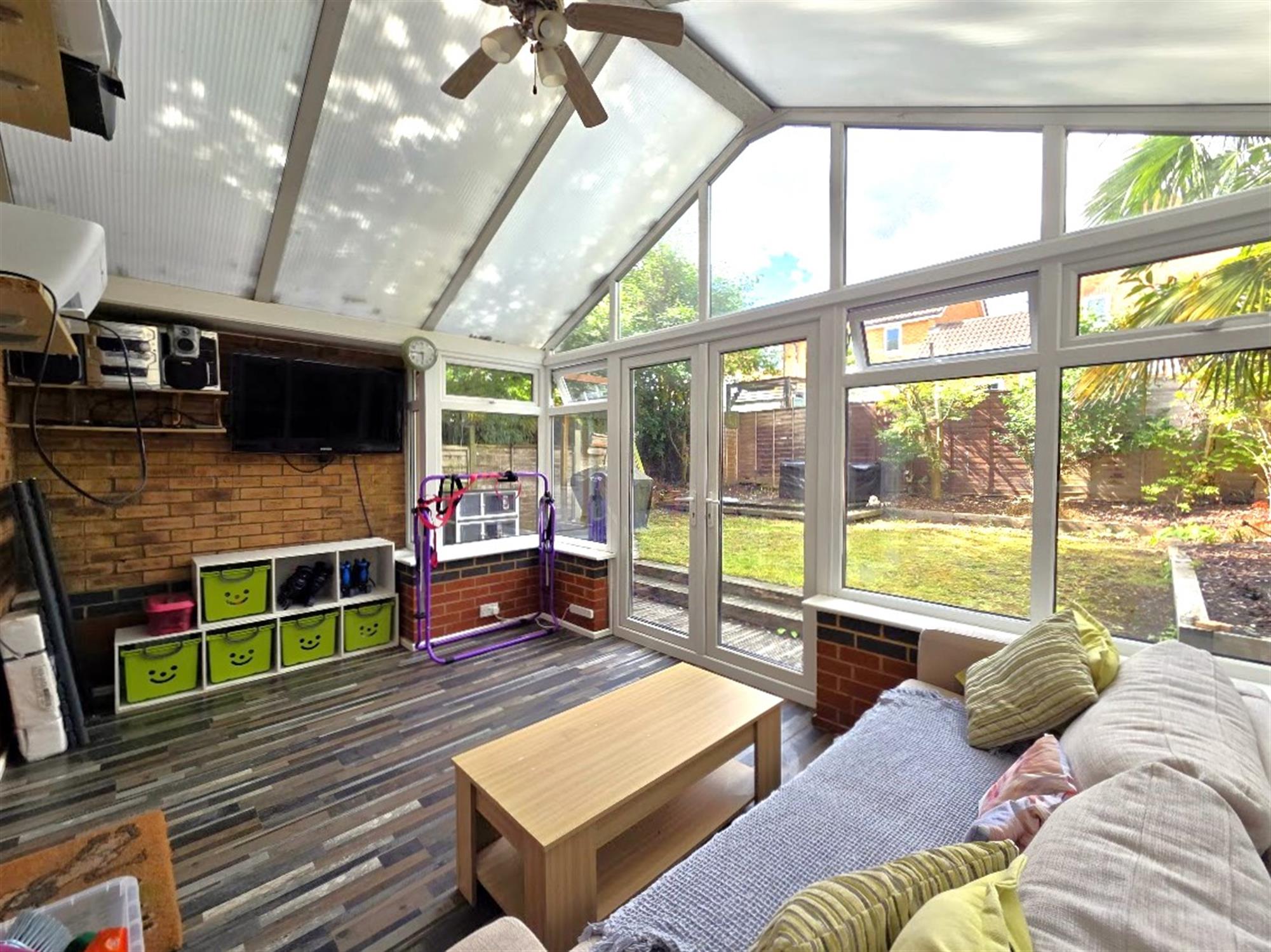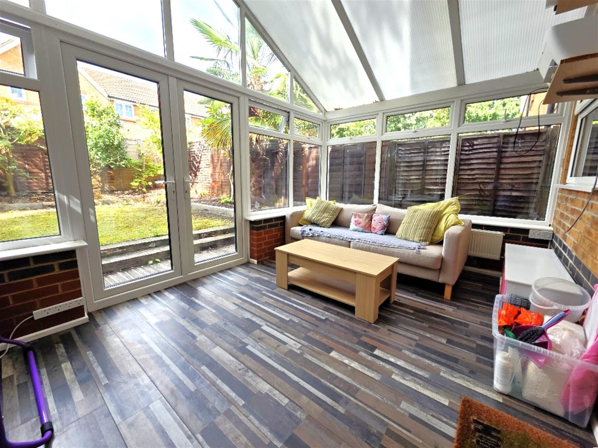 CONSERVATORY 14' 5" (4.39m) x 9' 6" (2.90m)Brick base with double-glazed elevations, polycarbonate roofing, double doors to rear garden, timber strip effect laminated flooring, radiator.