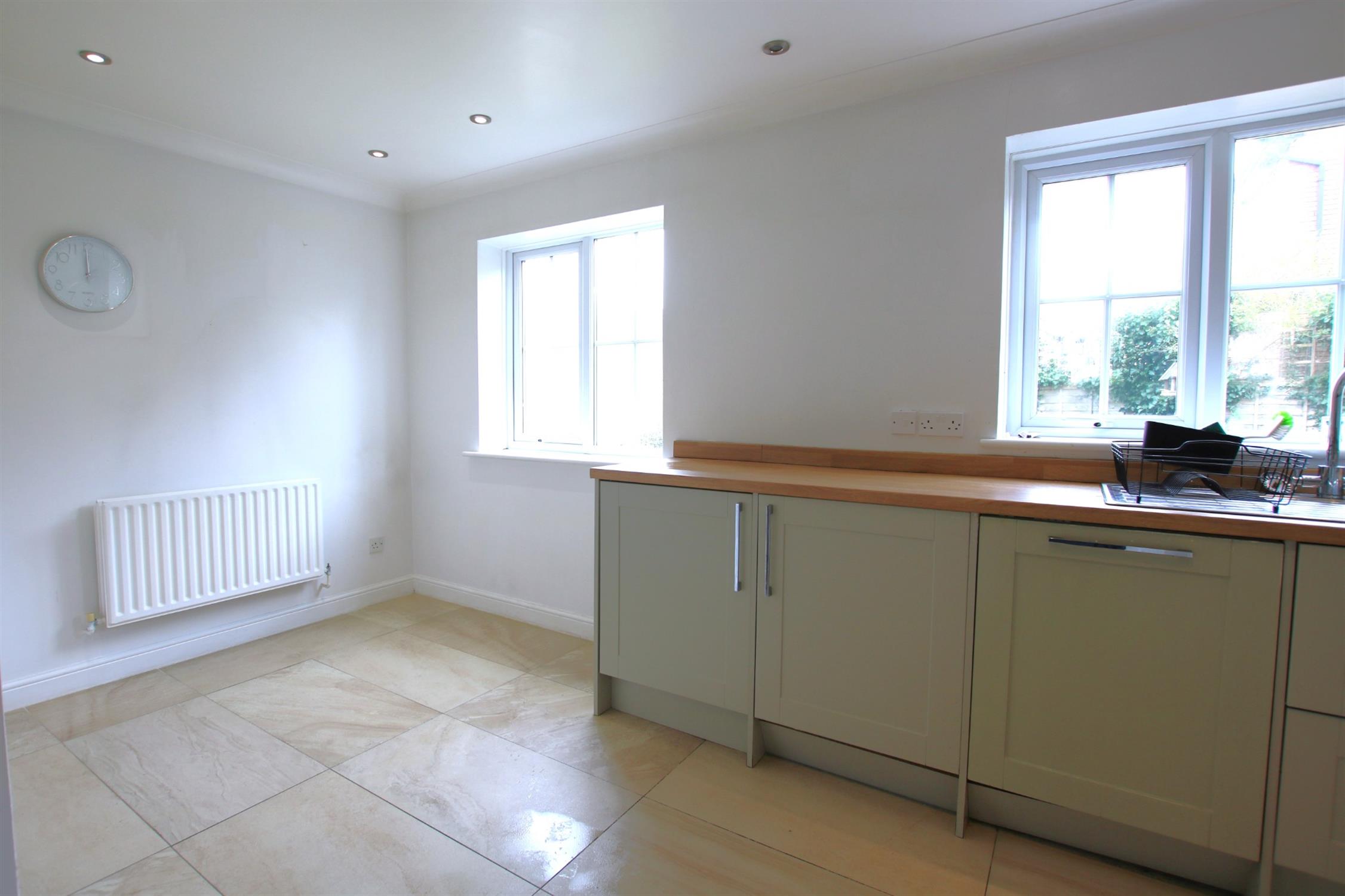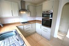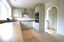 Refitted with a good range of wall and base units with complimenting, timber-effect roll top work surfaces, inset stainless steel one and a half bowl-single drainer sink with mixer tap, integrated dishwasher, fridge, freezer, eye level double oven and four-ring gas hob with extractor hood over. Double-glazed window to the rear aspect, radiator, tiled flooring, inset ceiling down lights, archway to: