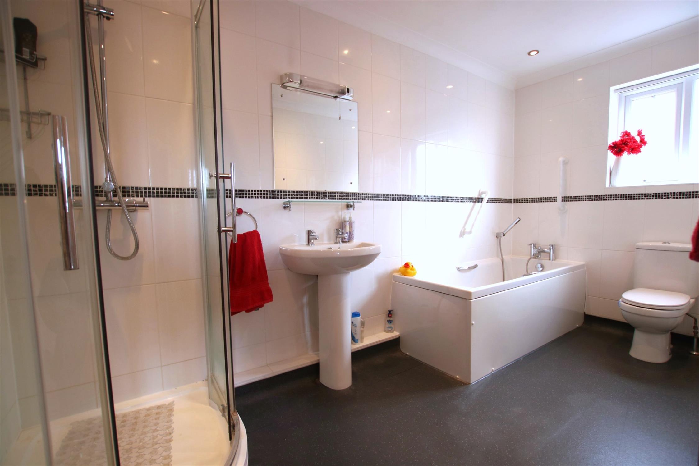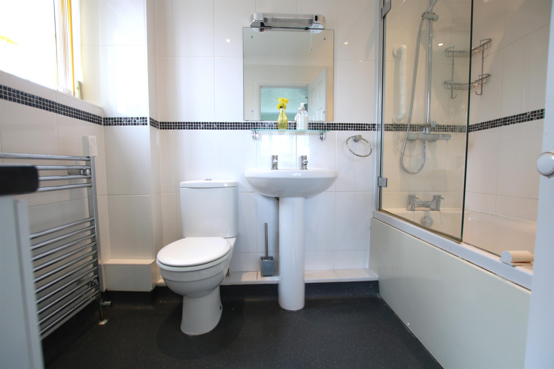 Three-piece suite comprising: panel enclosed bath with mixer tap, glazed shower enclosure, pedestal wash basin, low level WC, heated towel rail / radiator, ceramic tiled splash backs, double-glazed window to the side aspect.