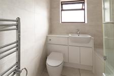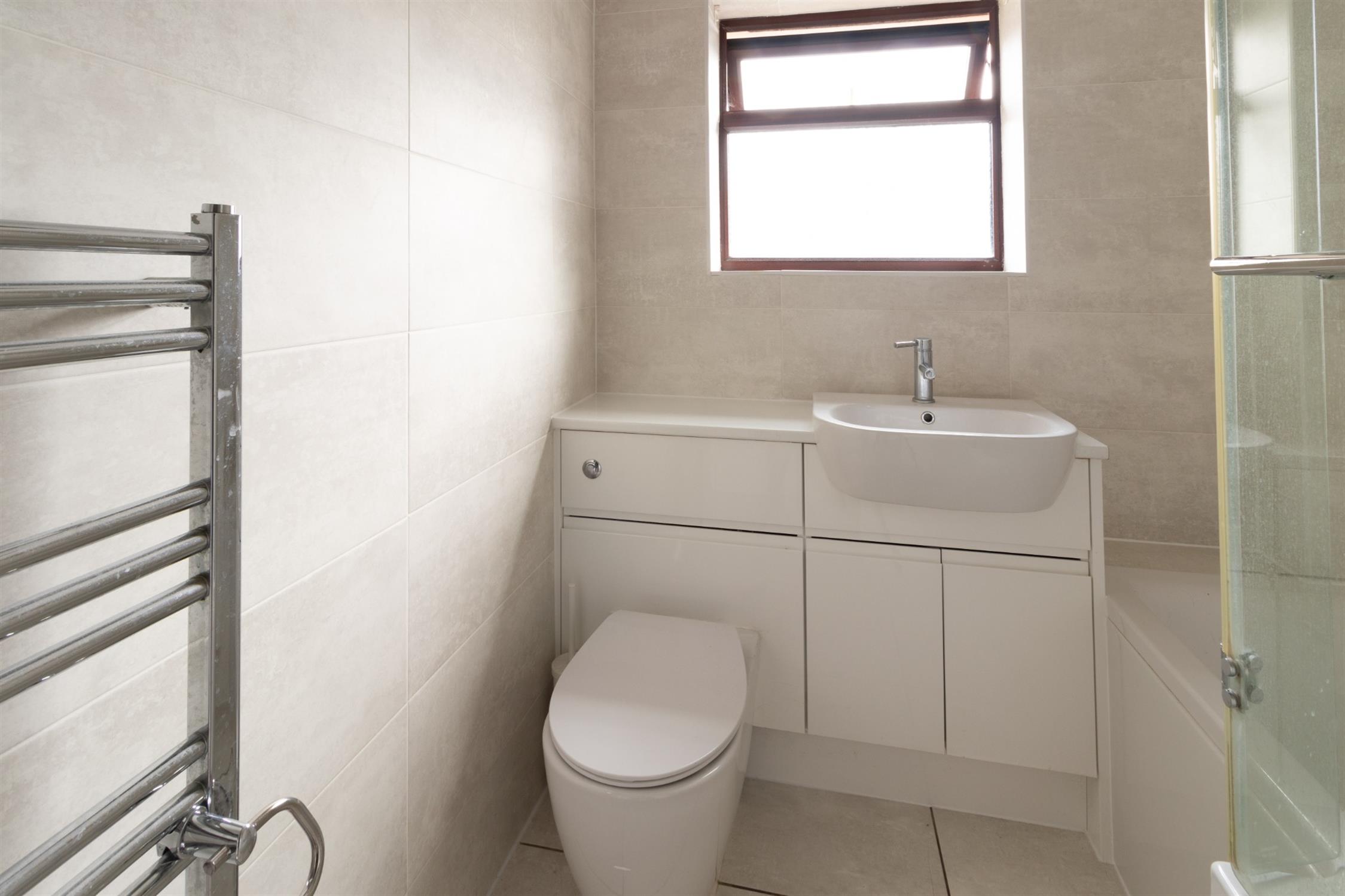 Double-glazed window to front aspect, panel enclosed bath with shower over, low flush WC, pedestal wash hand basin, heated towel rail.