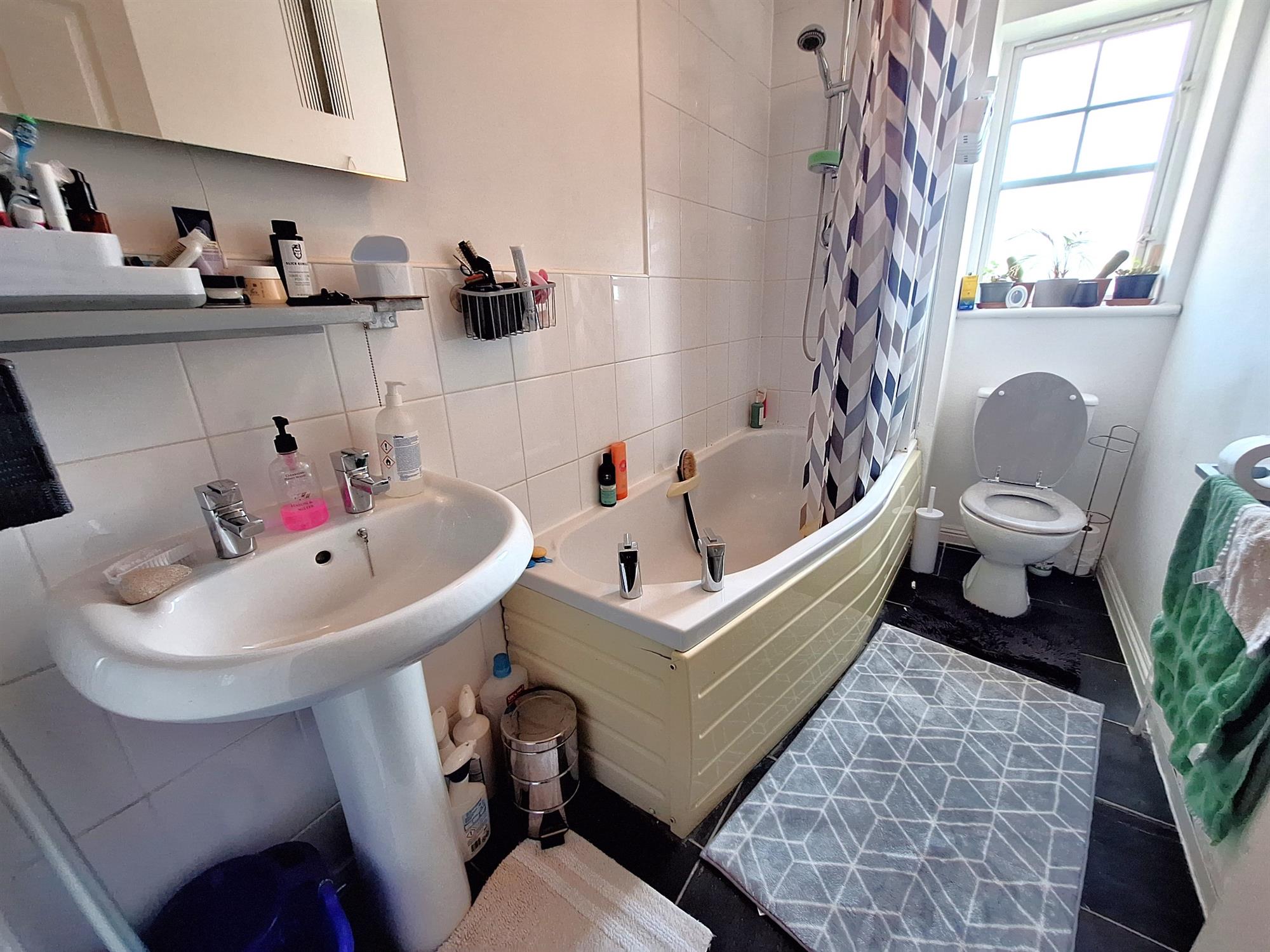 Tiled flooring, double-glazed frosted window to rear aspect, white suite comprising: panel enclosed bath with shower attachment above. Low-level WC. Pedestal basin.