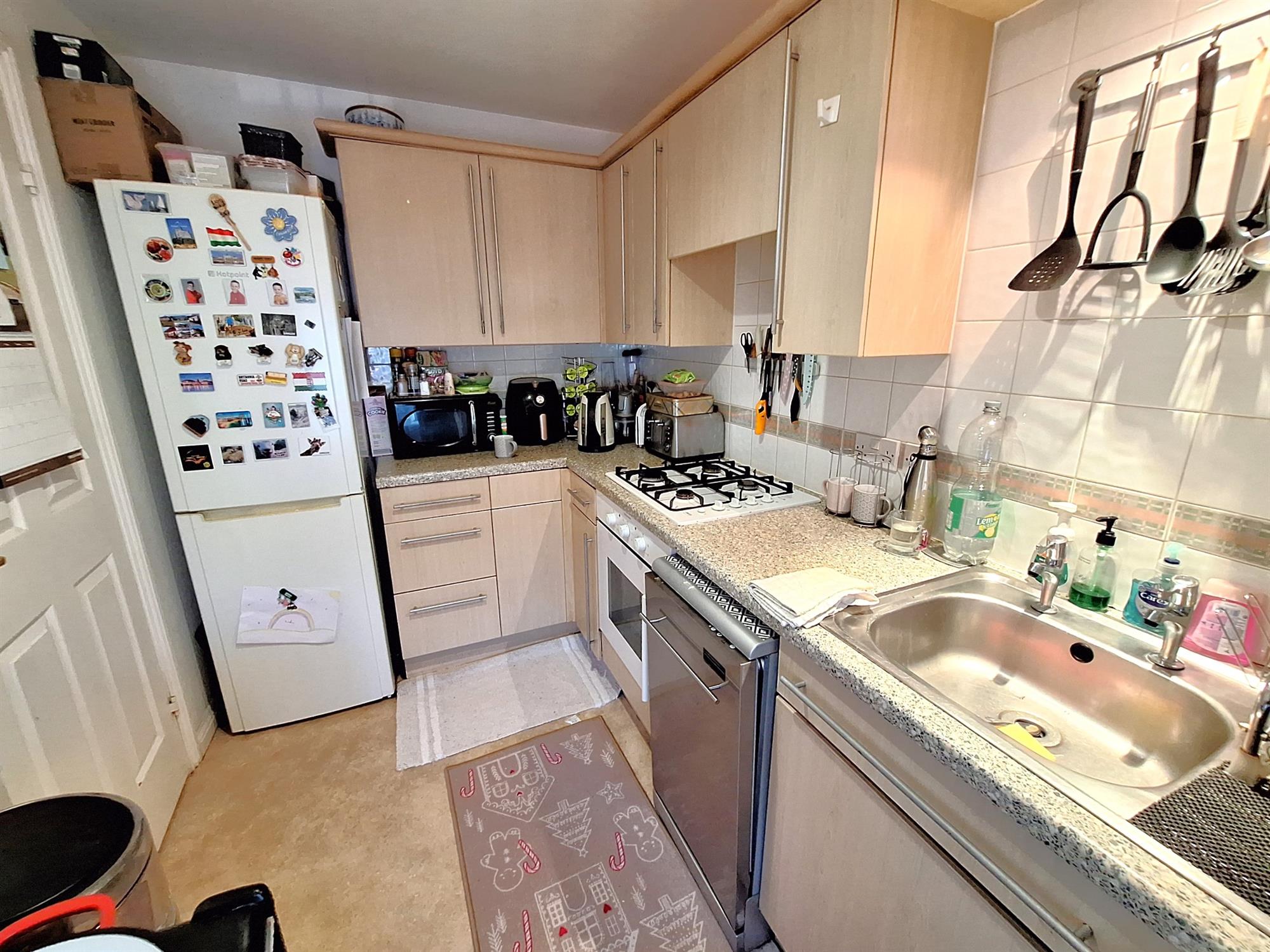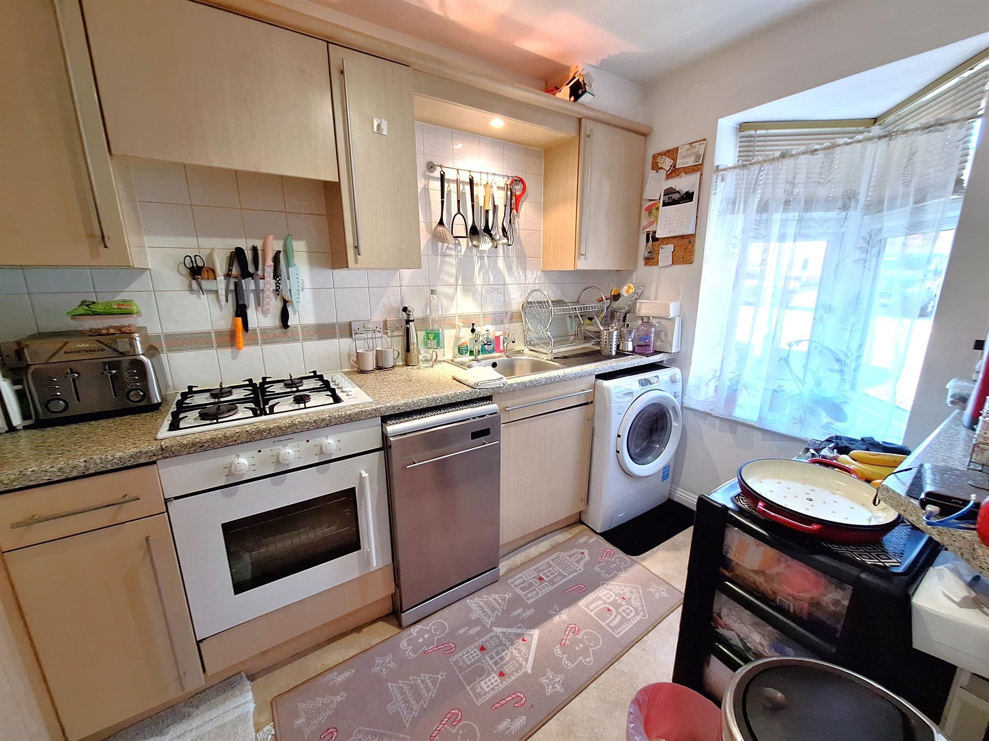Range of base and eye-level units, oven with 4-point gas hob, space for dishwasher, washing machine and fridge/freezer, chrome sink with drainer, laminate flooring, double-glazed window to front aspect