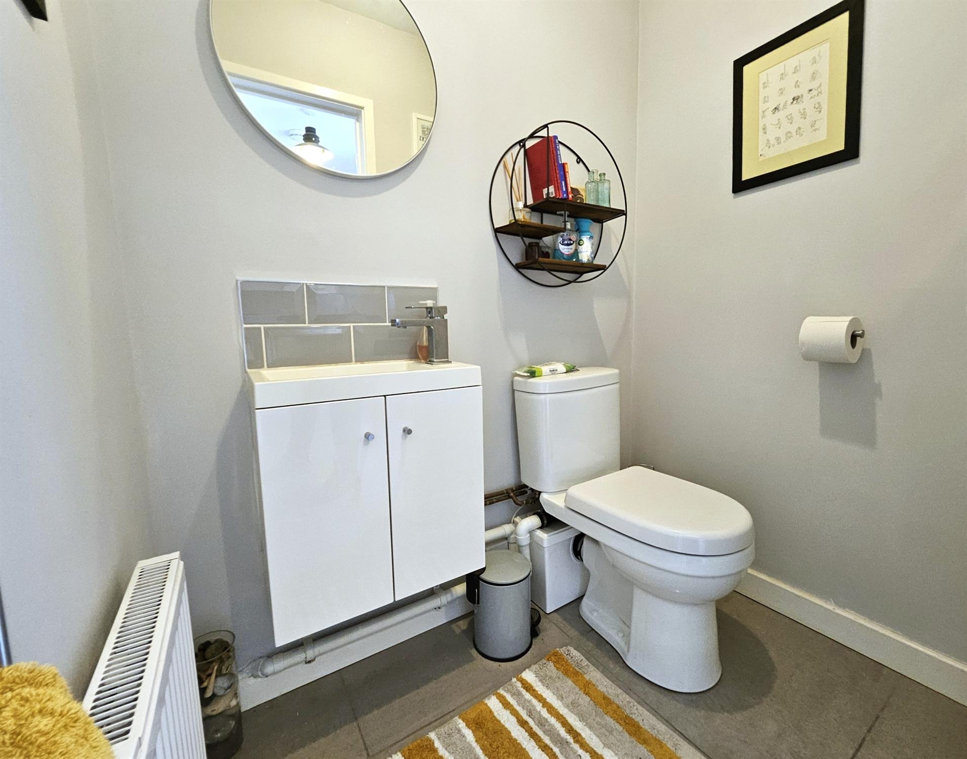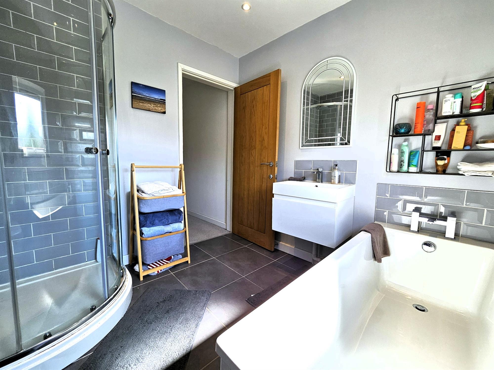 Upvc double-glazed window to the rear aspect, contemporary white fitted four-piece suite comprising: low-level WC, wall-hung vanity housed wash basin with drawers under, panel enclosed bath, metro tiled splash backs, glazed shower enclosure with metro tiled splash backs, heated towel rail - radiator, ceramic tiled flooring.