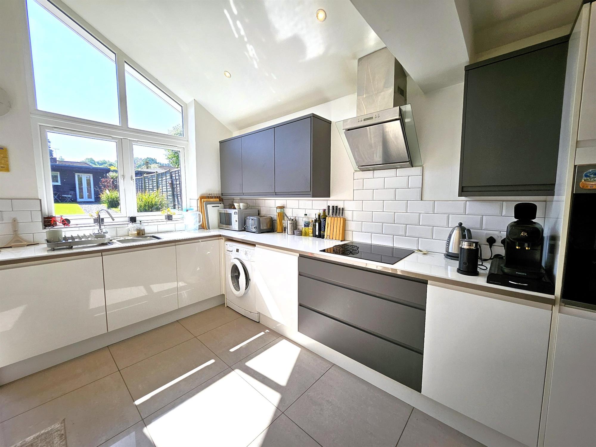 A stunning extended room with double-height ceiling to the rear aspect, a range of full-height double-glazed windows and doors to the rear aspect enjoying views over the southerly aspect rear garden, an extensive range of contemporary eye level and matching base fitted units, inset sink, integral fitted, oven, hob with contemporary feature extractor canopy-hood above, intergrated dishwasher and fridge freezer, wall-mounted boiler, two radiators, porcelain ceramic tiled flooring, space for dining table sofa and desk, inset ceiling downlights, two radiators.