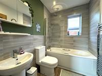 Double glazed obscure window to the side aspect, vanity housed wash hand basin with built around storage cupboard, low level toilet, timber effect vinyl flooring, extractor fan.