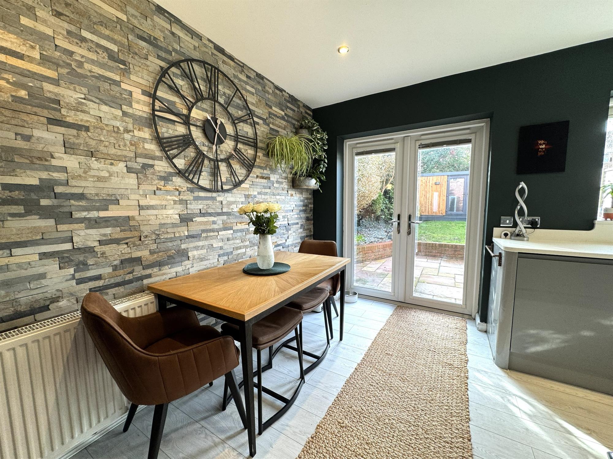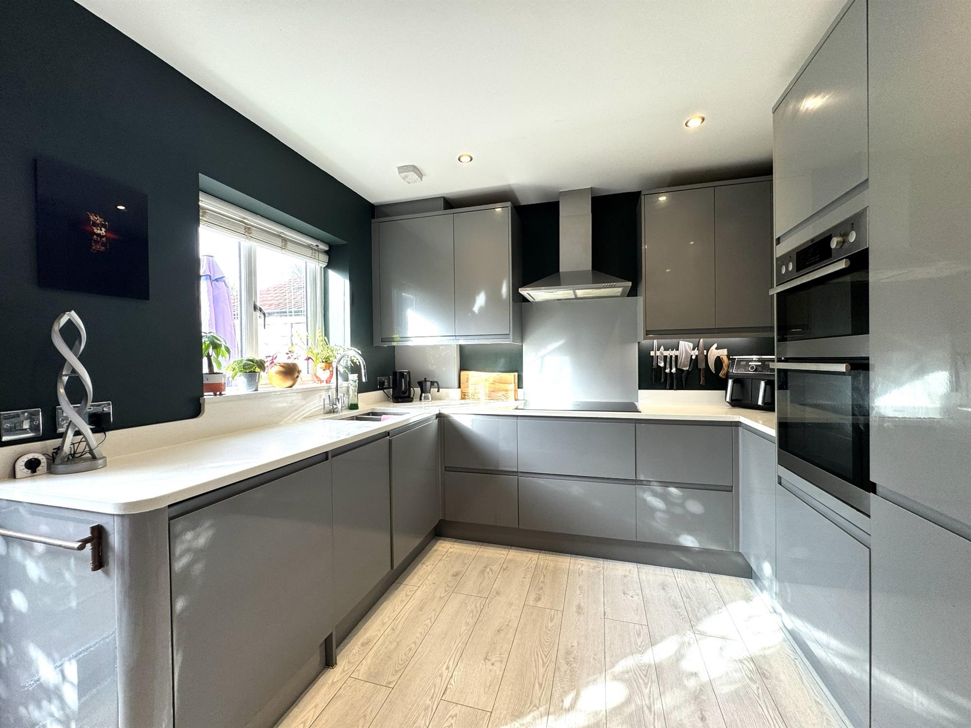 Range of full height high gloss grey eye and base units with quartz-granite ivory work surfaces with up-stands, inset one and a half stainless steel sink with mixer tap. Built in double AEG stainless steel electric oven, AEG ceramic five ring hob with tempered glass splash back, and stainless steel extractor hood over. Under unit lighting, fully integrated fridge/freezer, dishwasher and washing machine. Space for dining table and chairs, inset ceiling spotlights, timber effect vinyl flooring, radiator. TV aerial point, telephone point, electric plug sockets with USB charging points. Double glazed window and double glazed French door over looking the rear garden.