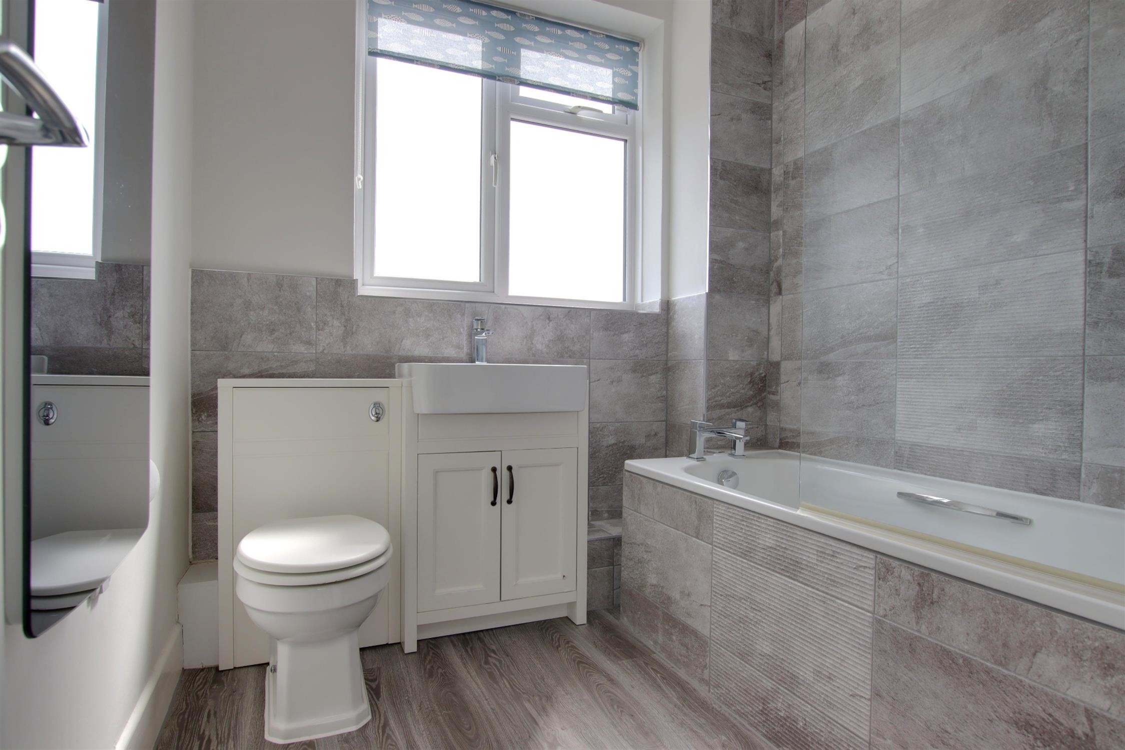 Double glazed obscure window to the rear aspect. Smooth ceiling. Modern suite comprising bath with shower over and screen. Vanity unit with wash hand basin and low level WC. 'Dimplex' electric towel rail. Grey wood effect laminate flooring.