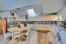 Smooth plastered twin apex vaulted ceilings with Velux style windows. UPVC window and bifold doors to rear garden. Range of fitted wall and floor cupboards with drawer units. Tiled splashback. Sink/drainer set in, matching work surface. Space for free standing cooker with cooker hood over. Space and plumbing for washing machine. Wood burner. Tiled Flooring. Door to shower room;