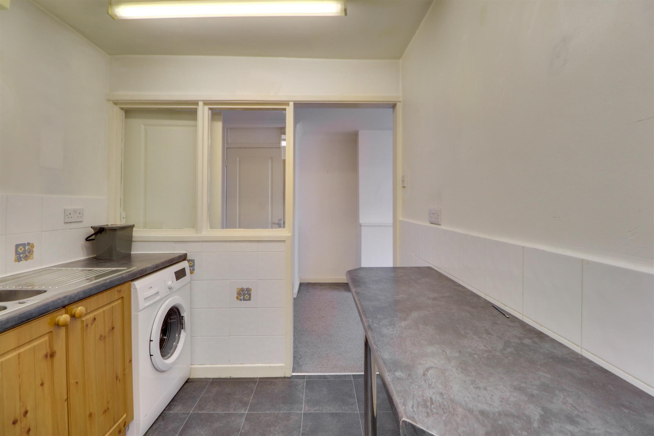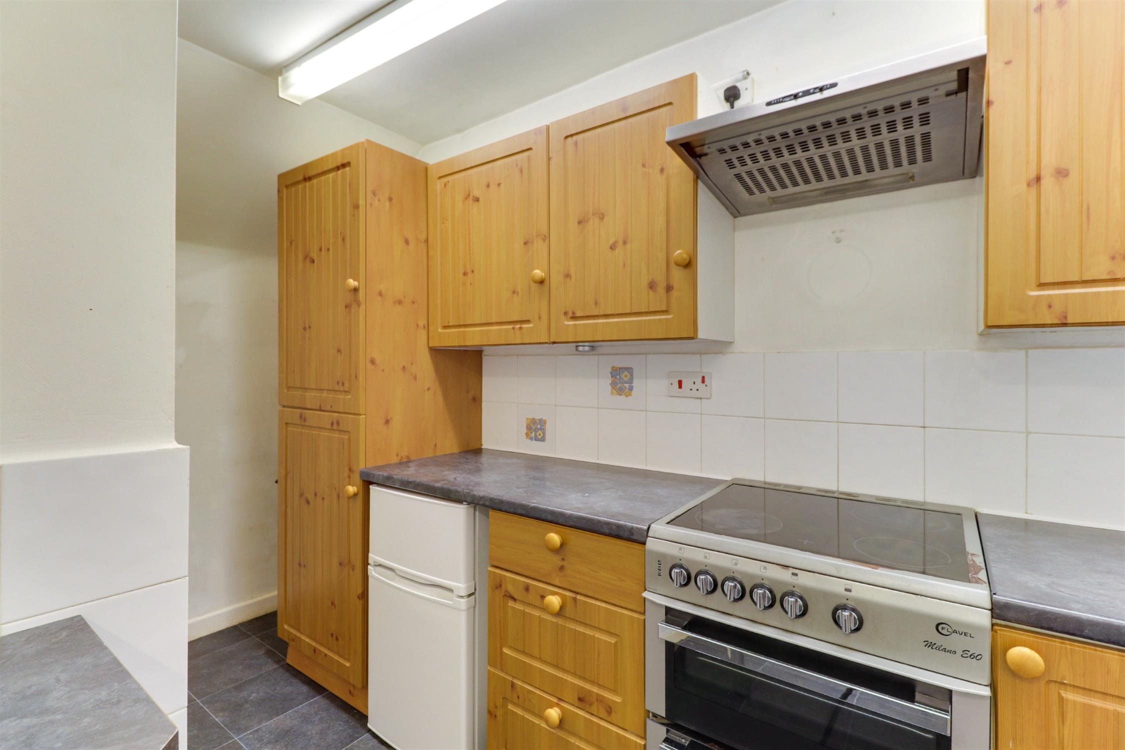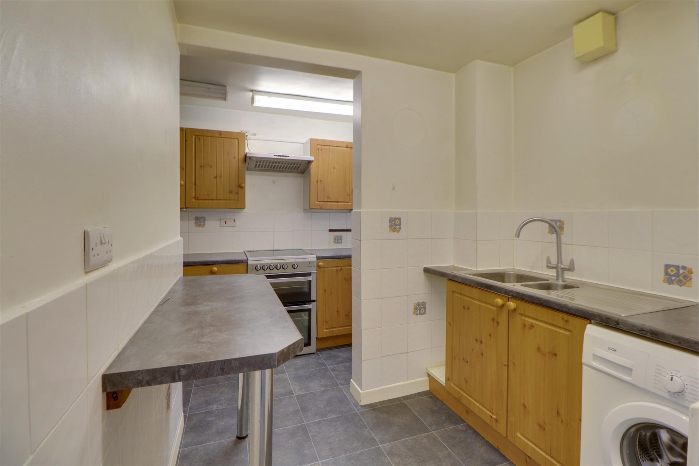 Smooth ceiling, part tiled walls, a range of wall and base mounted units, space for oven with extractor fan, space for appliances, integrated fridge freezer, vinyl flooring