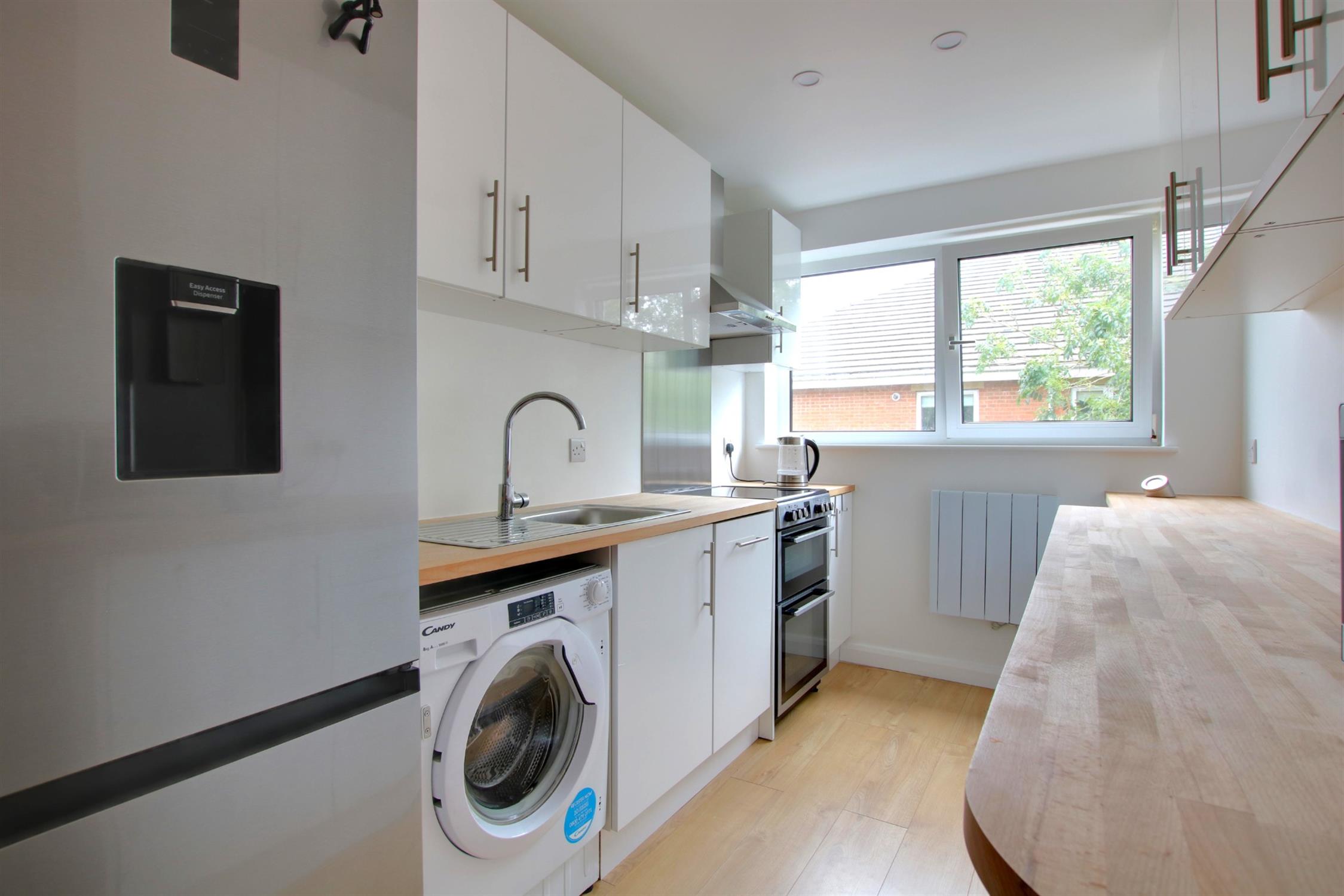 Laminate flooring. Range of matching wall and base units with wooden counter top. Inset stainless steel sink with drainer. Integrated dishwasher. Space for cooker, washing machine and fridge-freezer. Cupboard housing newly fitted hot water tank. Double-glazed window to side aspect. Electric radiator.