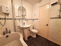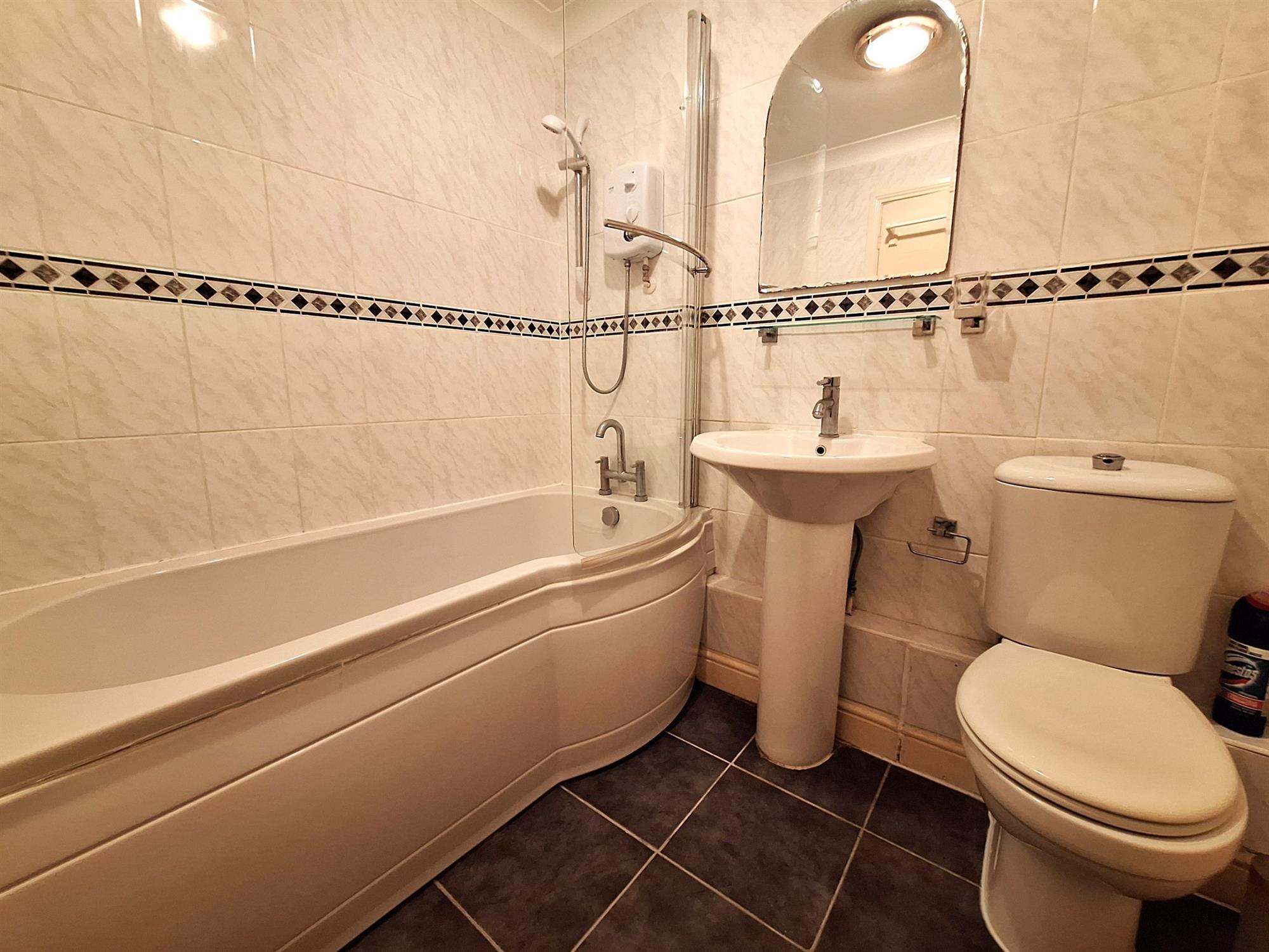 Three-piece white bathroom suite, with WC, ceramic sink with single chrome mixer tap and bath with electric shower and screen, tiled flooring, extractor fan, door to airing cupboard housing water cylinder.