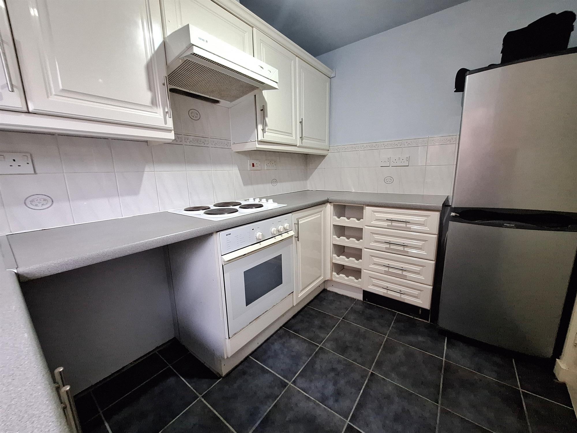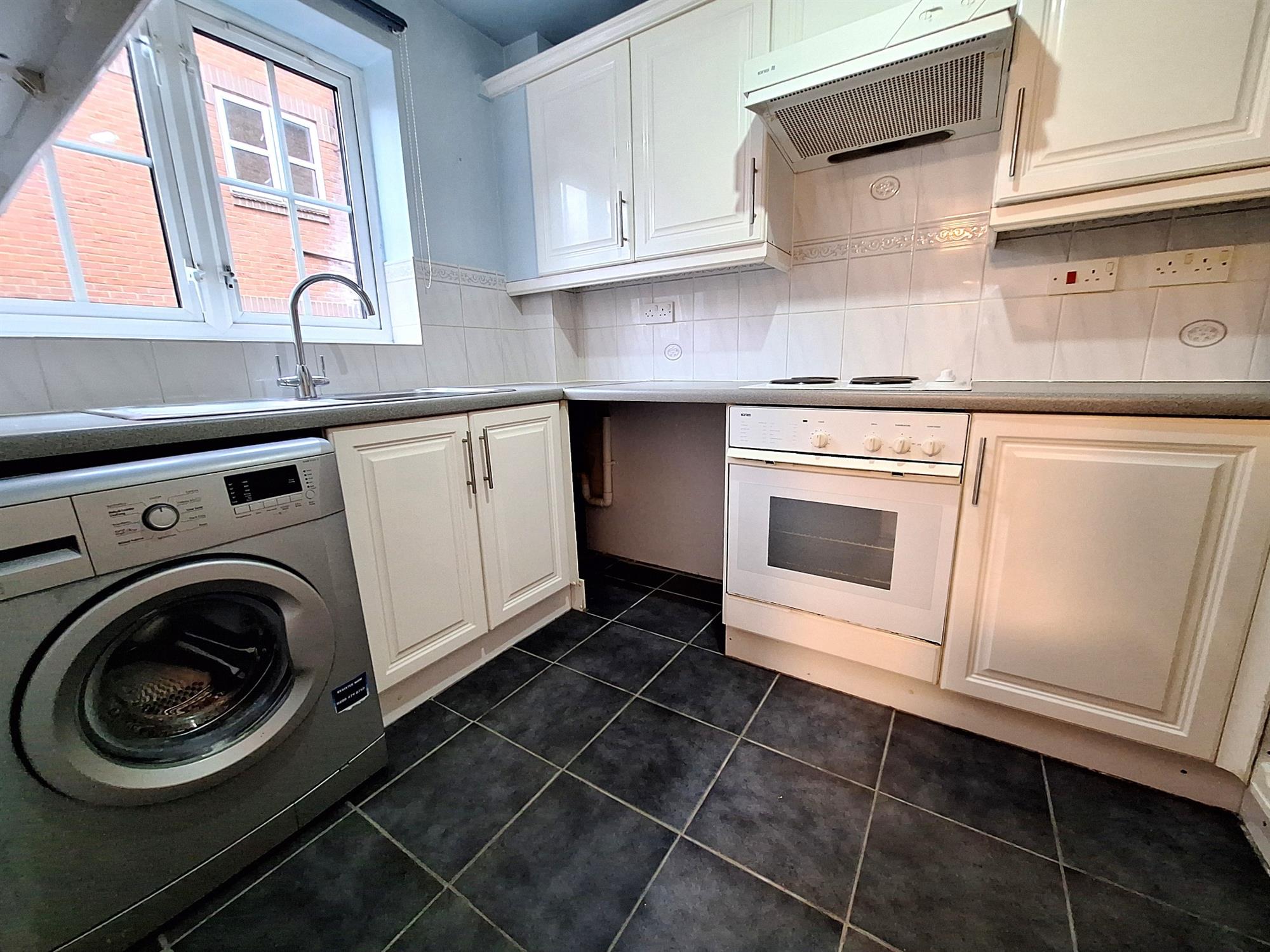 Range of eye and base level units, Integral oven and integrated four-point electric hob with extractor over, ceramic tiled splashback, space for fridge/freezer, dishwasher and washing machine, tiled flooring, double-glazed UPVC window to side aspect.
