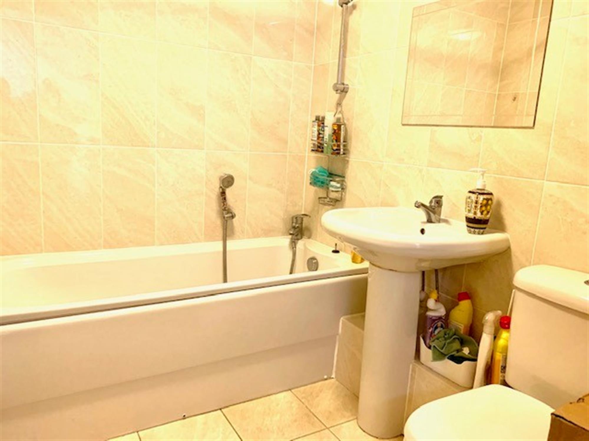 Smooth plastered ceiling with coving. Tiling. Heated towel rail. A three piece suite comprising: bath with mains shower head over, ceramic sink with mono bloc tap fitting in chrome finish and low level w.c.