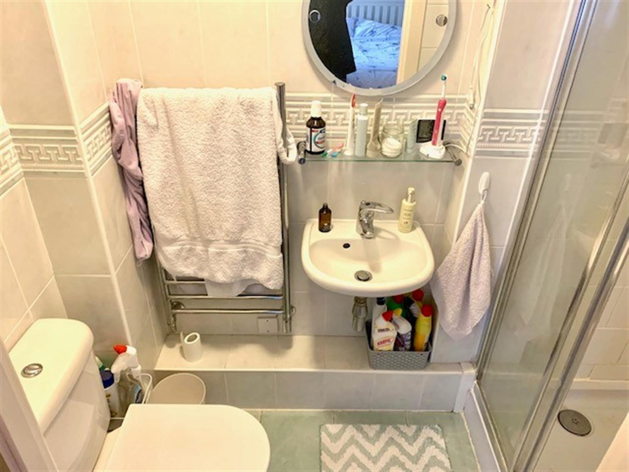 Smooth plastered ceiling with LED spotlighting. Three piece suite comprising; shower cubicle, ceramic sink with swan neck mixer tap in chrome finish and low level w.c. Tiling.