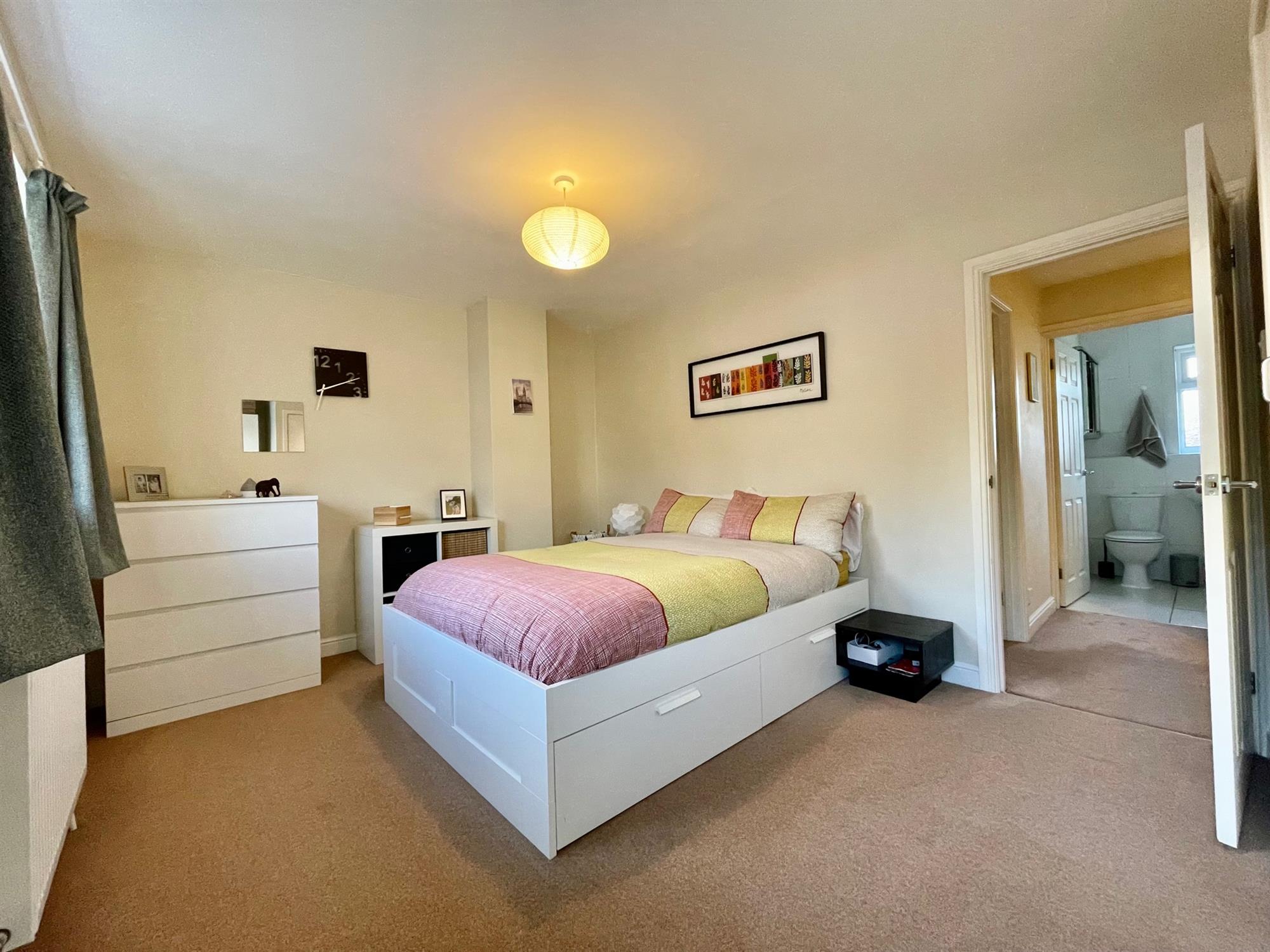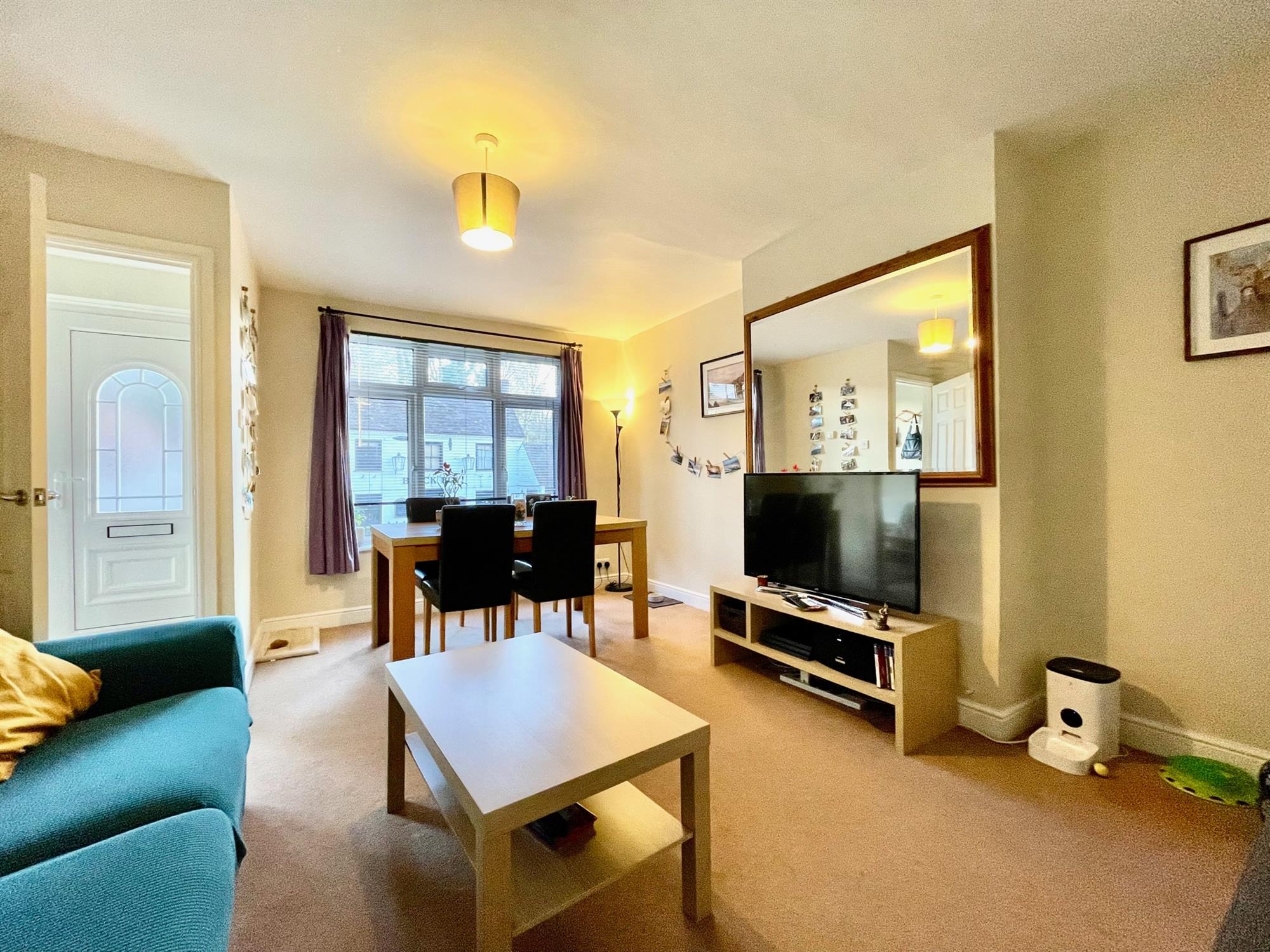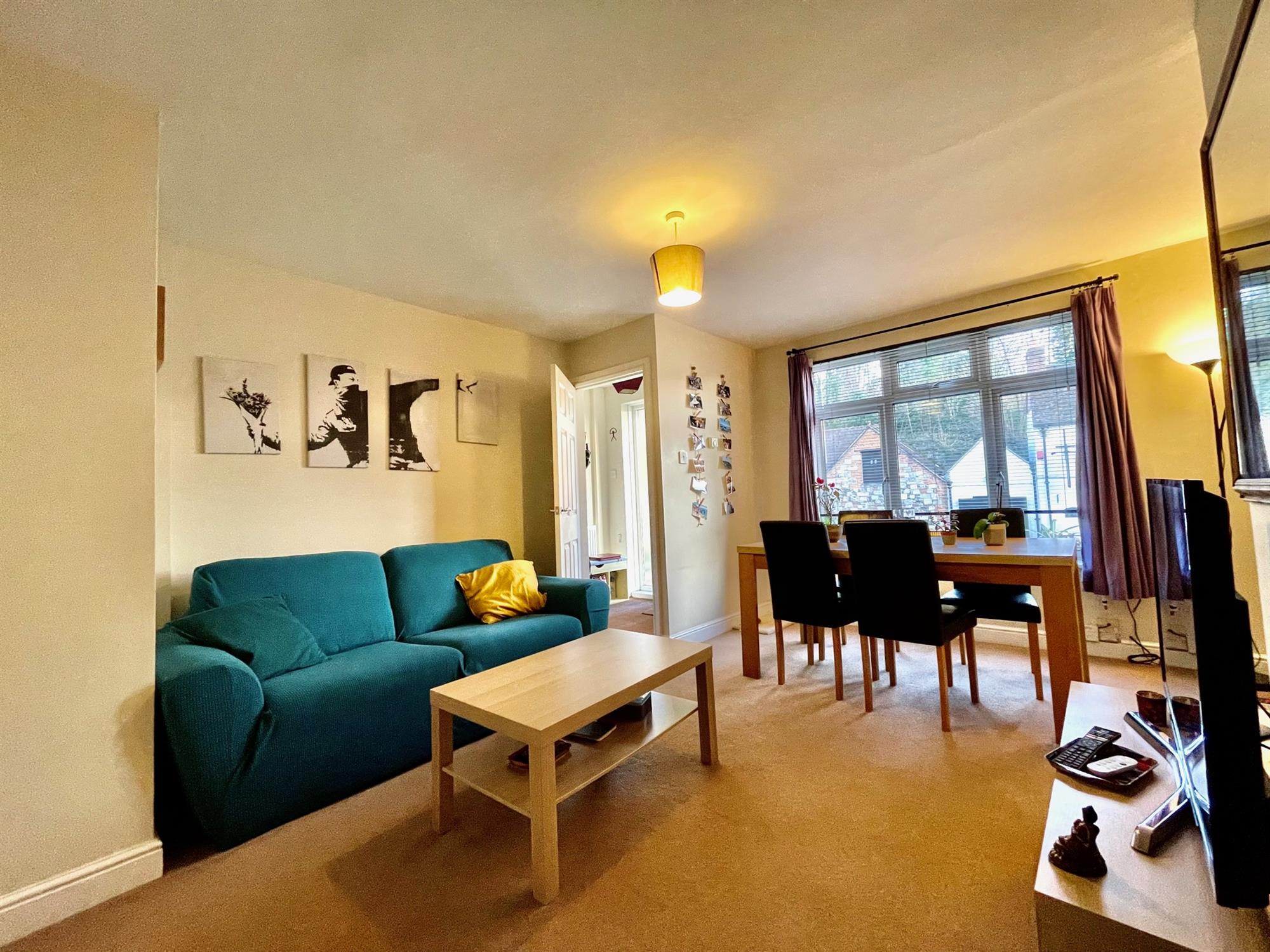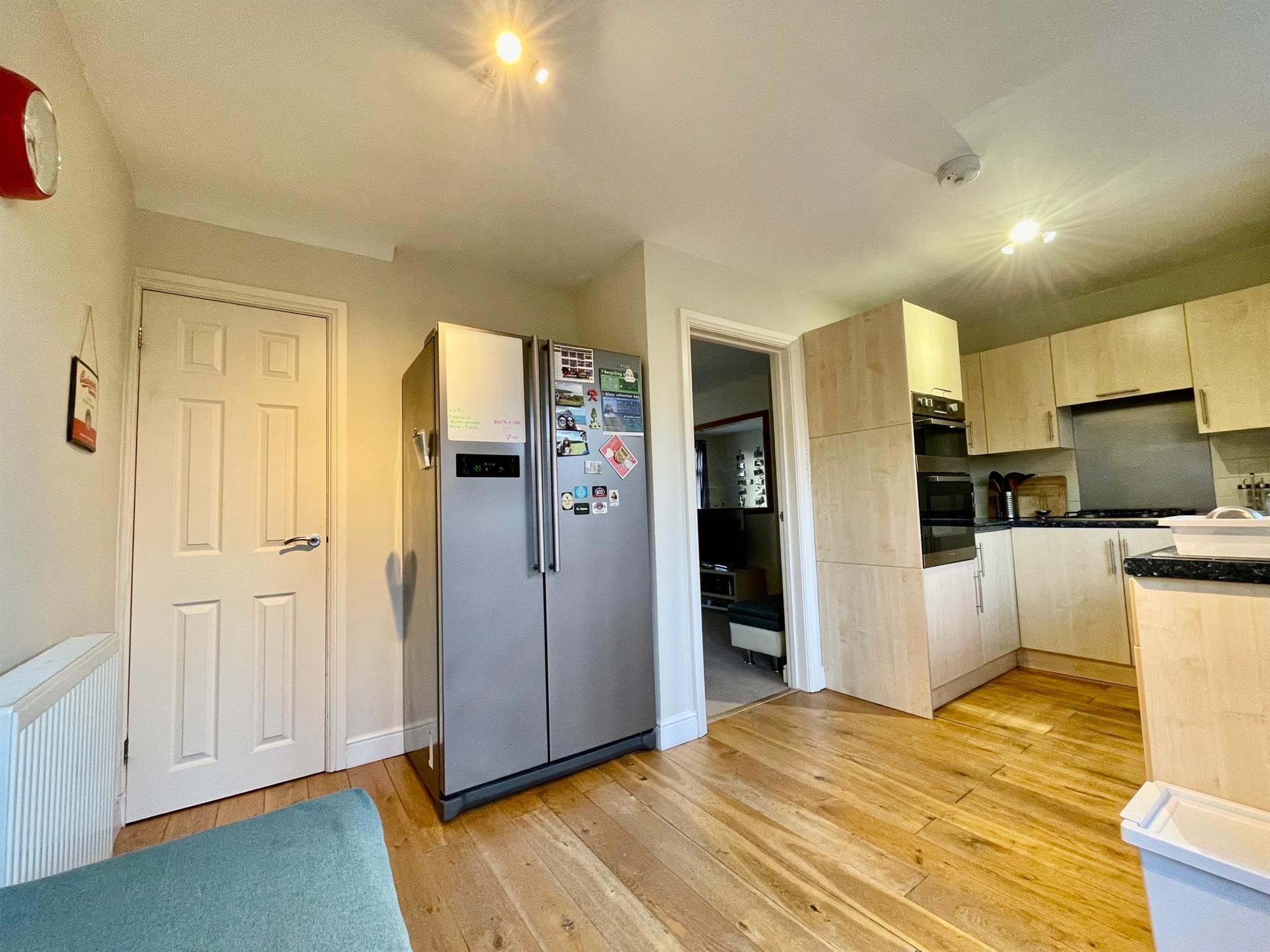 Upon entry, there is a useful entry hall with room for shoes and coats which leads through to the living room and has stairs which rise to the first floor. The living room is located to the front of the property and benefits from a warm southerly aspect. It is spacious in size and offers space for both lounge and dining furniture. From the living room, a door leads to the kitchen which is fitted with a range of eye and low-level units and integrated appliances. French doors open to the rear garden and allow ample light into the space, and there is also built-in storage under the stairs.