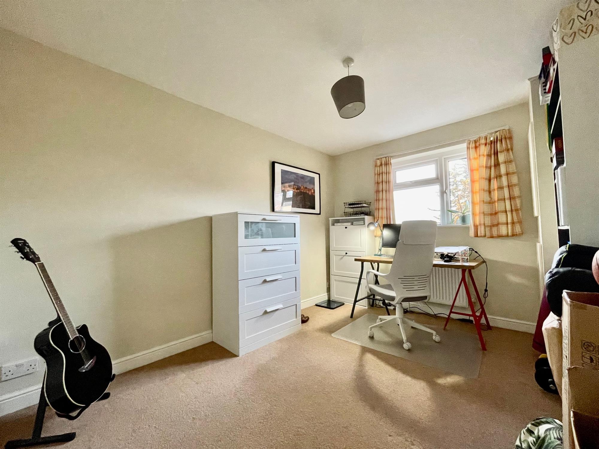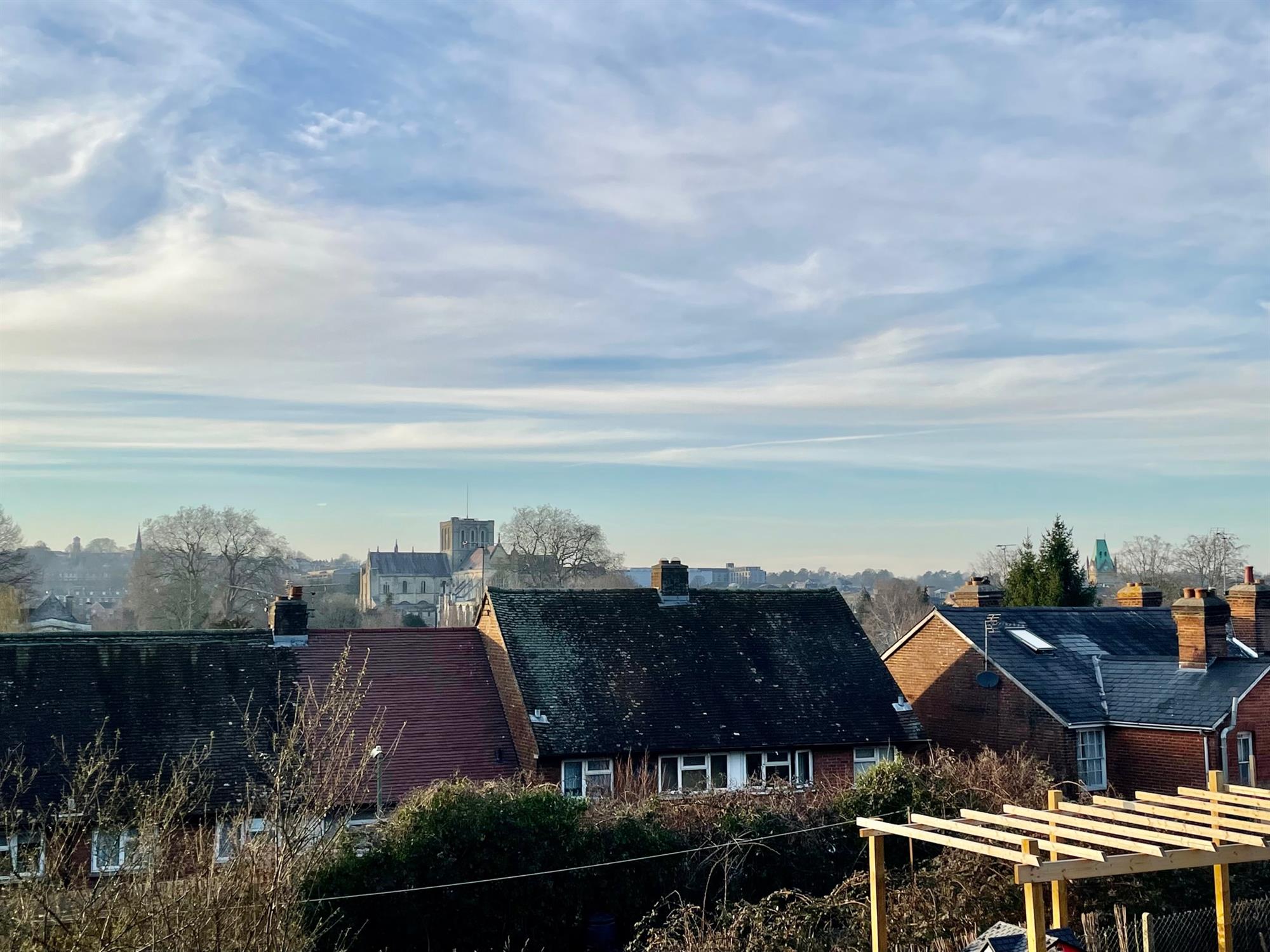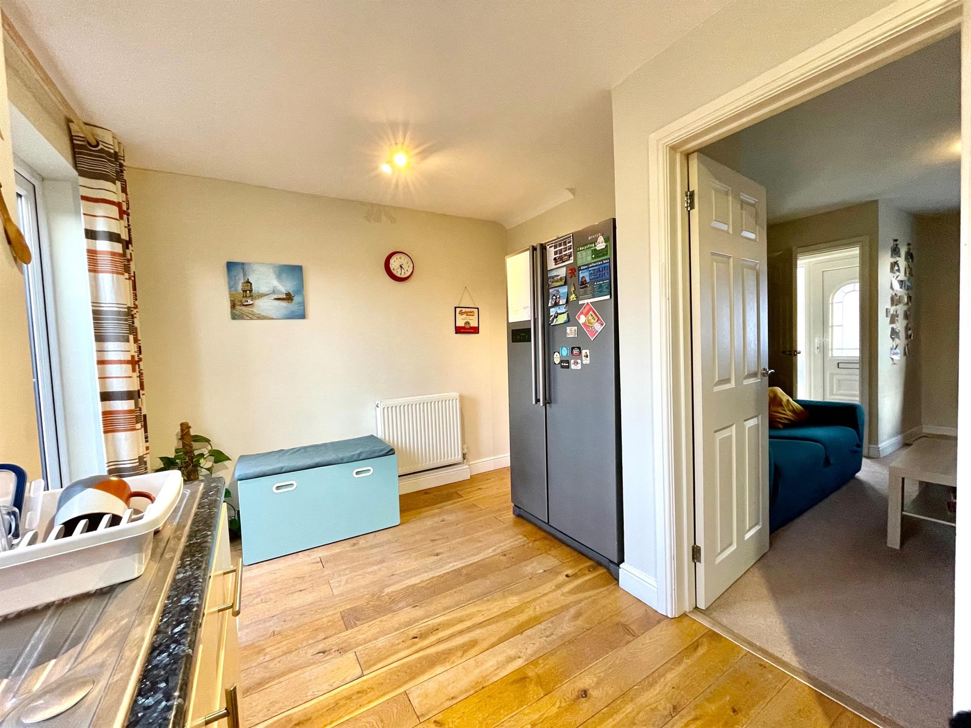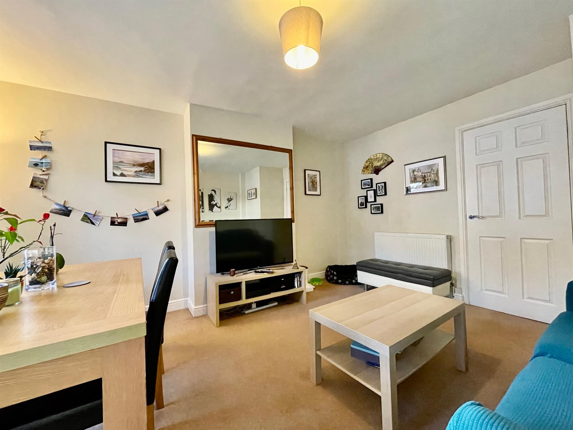 Upon entry, there is a useful entry hall with room for shoes and coats which leads through to the living room and has stairs which rise to the first floor. The living room is located to the front of the property and benefits from a warm southerly aspect. It is spacious in size and offers space for both lounge and dining furniture. From the living room, a door leads to the kitchen which is fitted with a range of eye and low-level units and integrated appliances. French doors open to the rear garden and allow ample light into the space, and there is also built-in storage under the stairs.