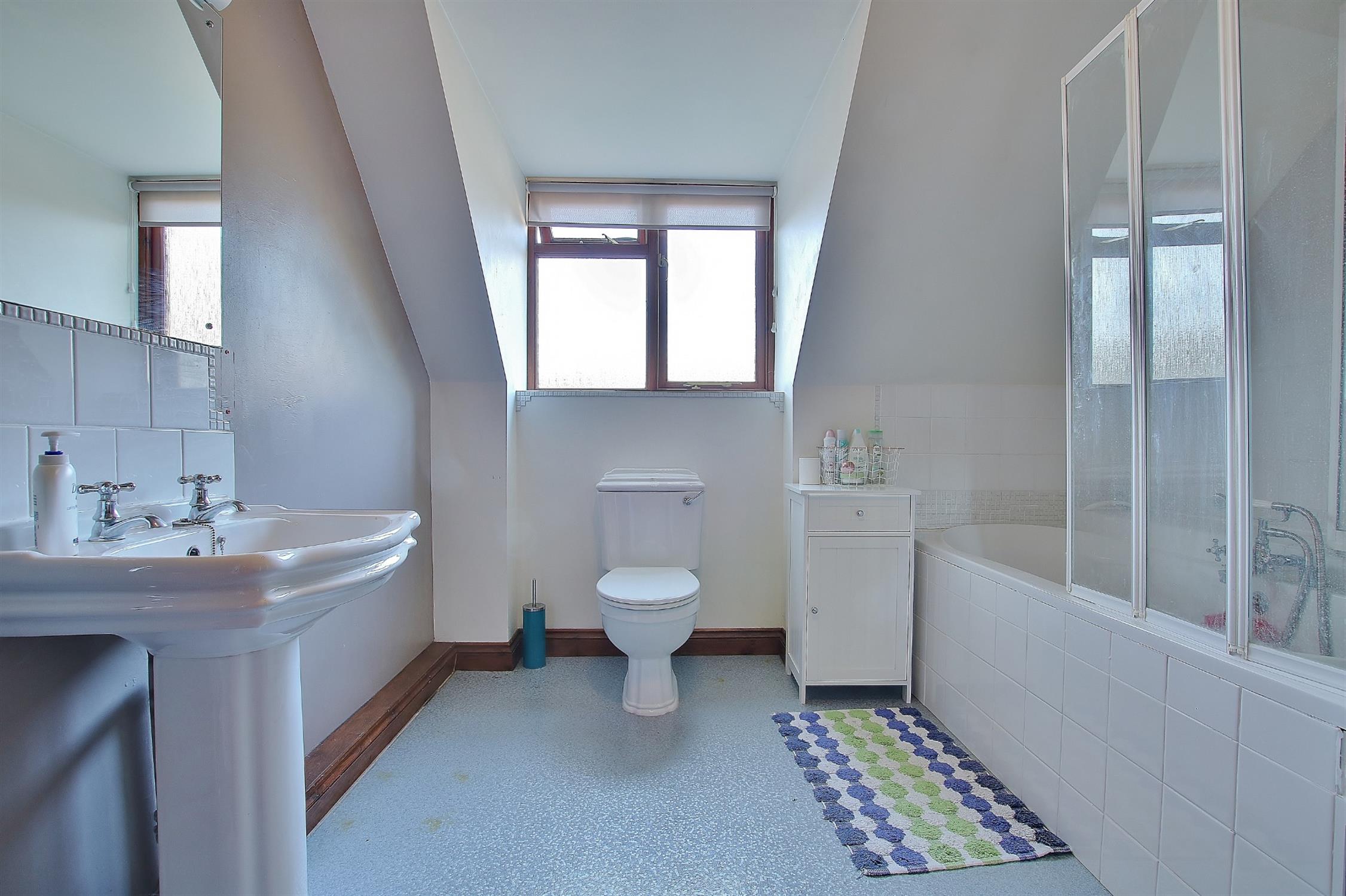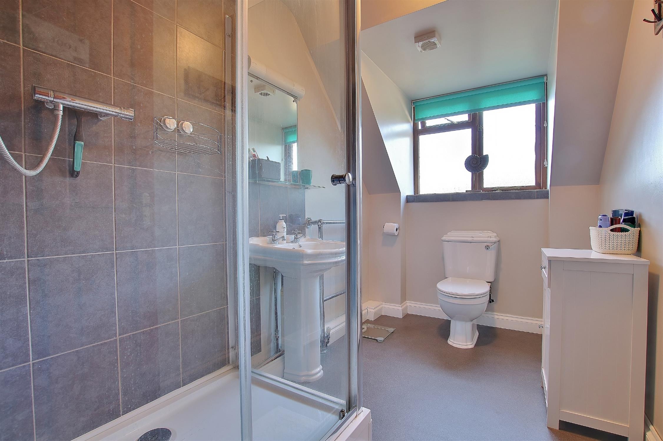 Modern suite comprising, double shower cubicle, low level w.c and pedestal wash hand basin. Chrome finish heated towel rail, extractor fan and double glazed obscured glass window to the rear aspect.