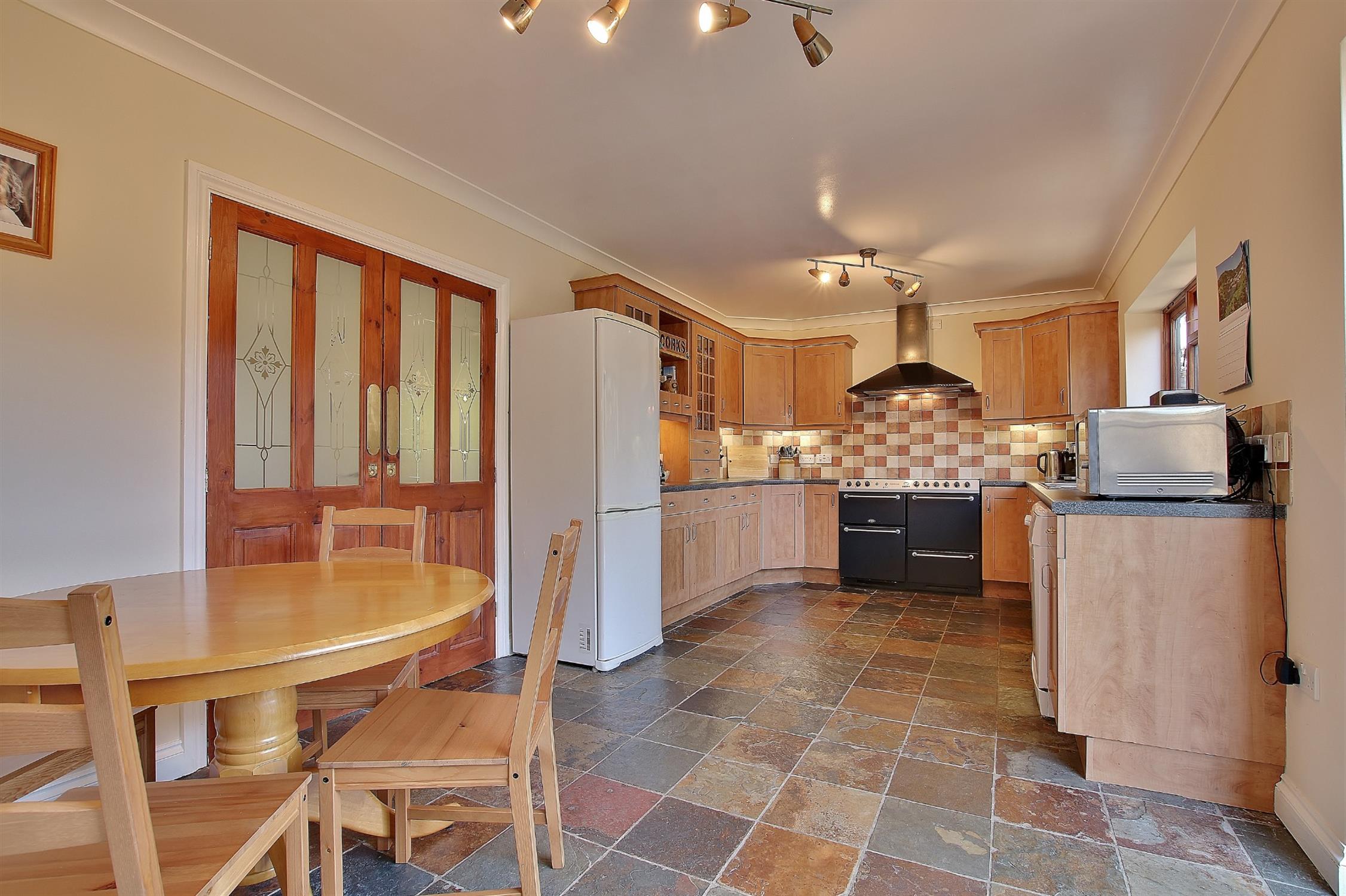 Fitted with a range of base and eye level units with roll edge work tops, tiled splash backs and under pelmet lighting. Range cooker with six burner gas hob and matching extractor hood. Space and plumbing for a dishwasher, one and a half bowl sink and drainer beneath the double glazed window overlooking the garden. Glazed double doors leading to the garden. Slate flooring running throughout.