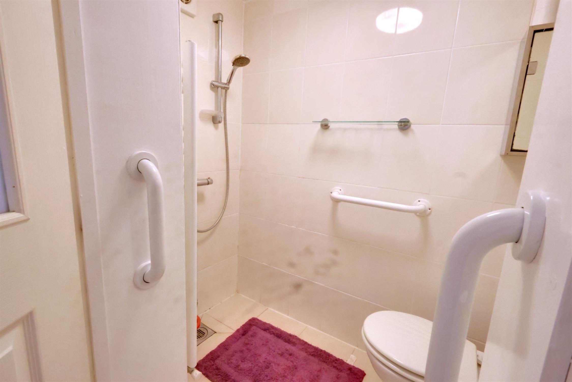 Walk in shower with grab rails, dual flush toilet, sink, ladder radiator, extractor fan.