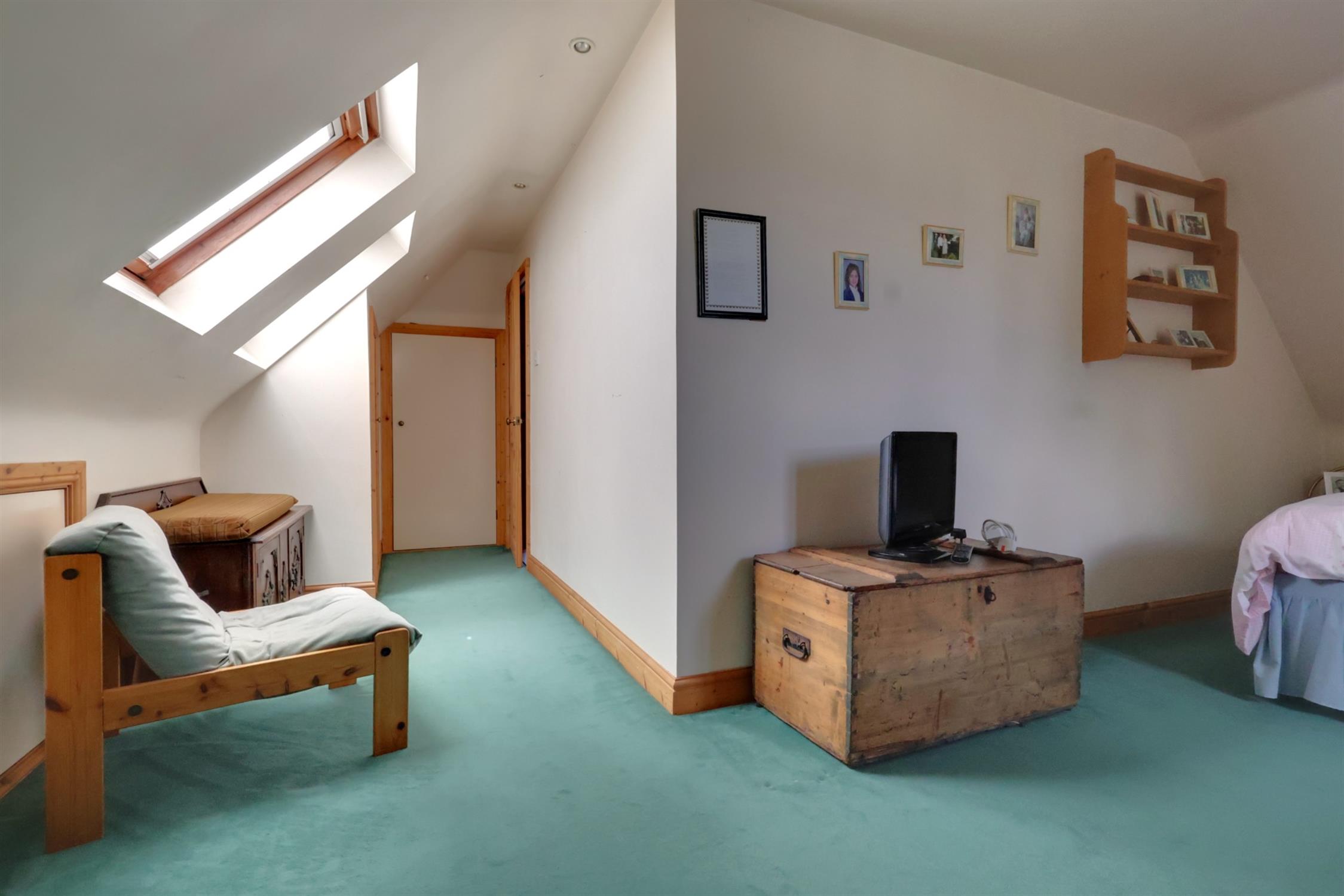 Generous L shape room with double glazed dormer window to front aspect. Two velux style windows to the side. Radiator. Eaves storage cupboards.