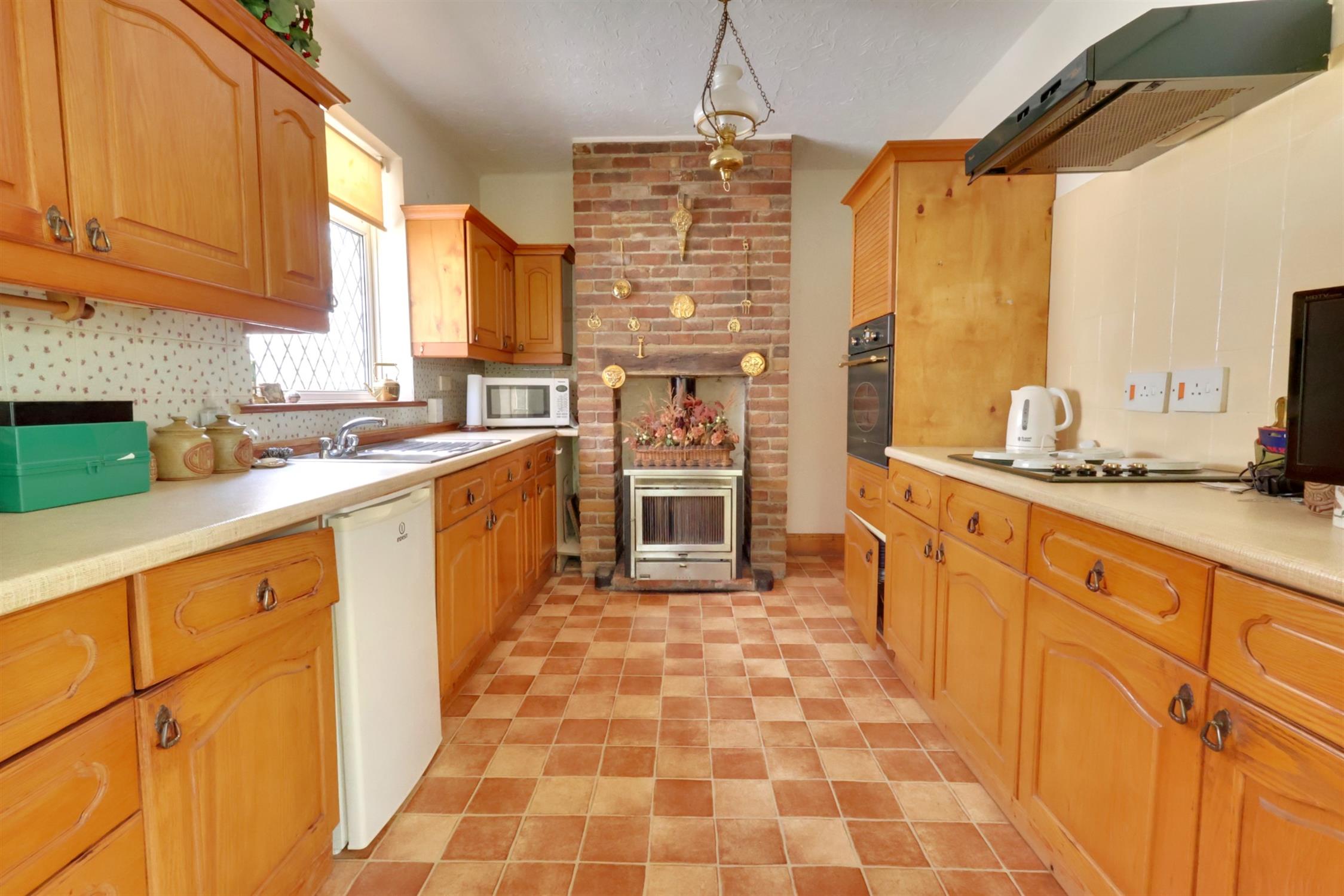 Double glazed twin aspect room with bow window overlooking the rear garden. Range of fitted floor and wall units with contrasting work surfaces and complimentary tiling to the walls. Inset stainless steel sink unit. Four ring hob with extractor hood over. Eye level oven. Space for fridge. Solid fuel stove. Stable door with feature arched window to the side open into the conservatory.