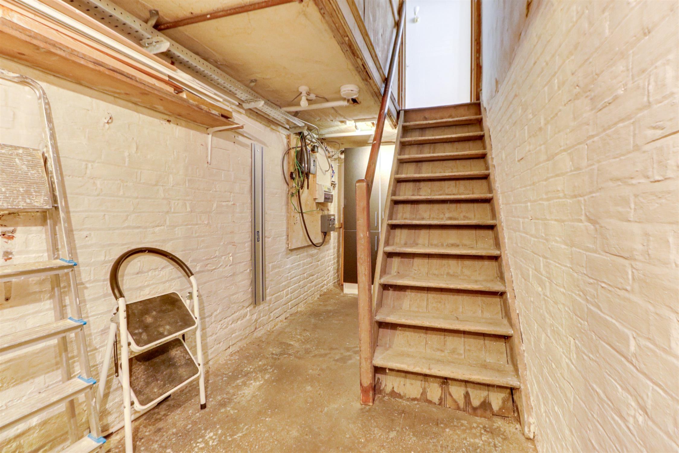 Textured and coved ceiling, radiator, door down to basement, fitted carpet.