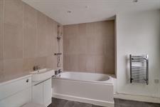 Smooth ceiling with inset spotlights, UPVC double-glazed window, panal bath with shower over, tiled splash back, wash hand basin, low level W.C, ladder towel radiator and tiled flooring.