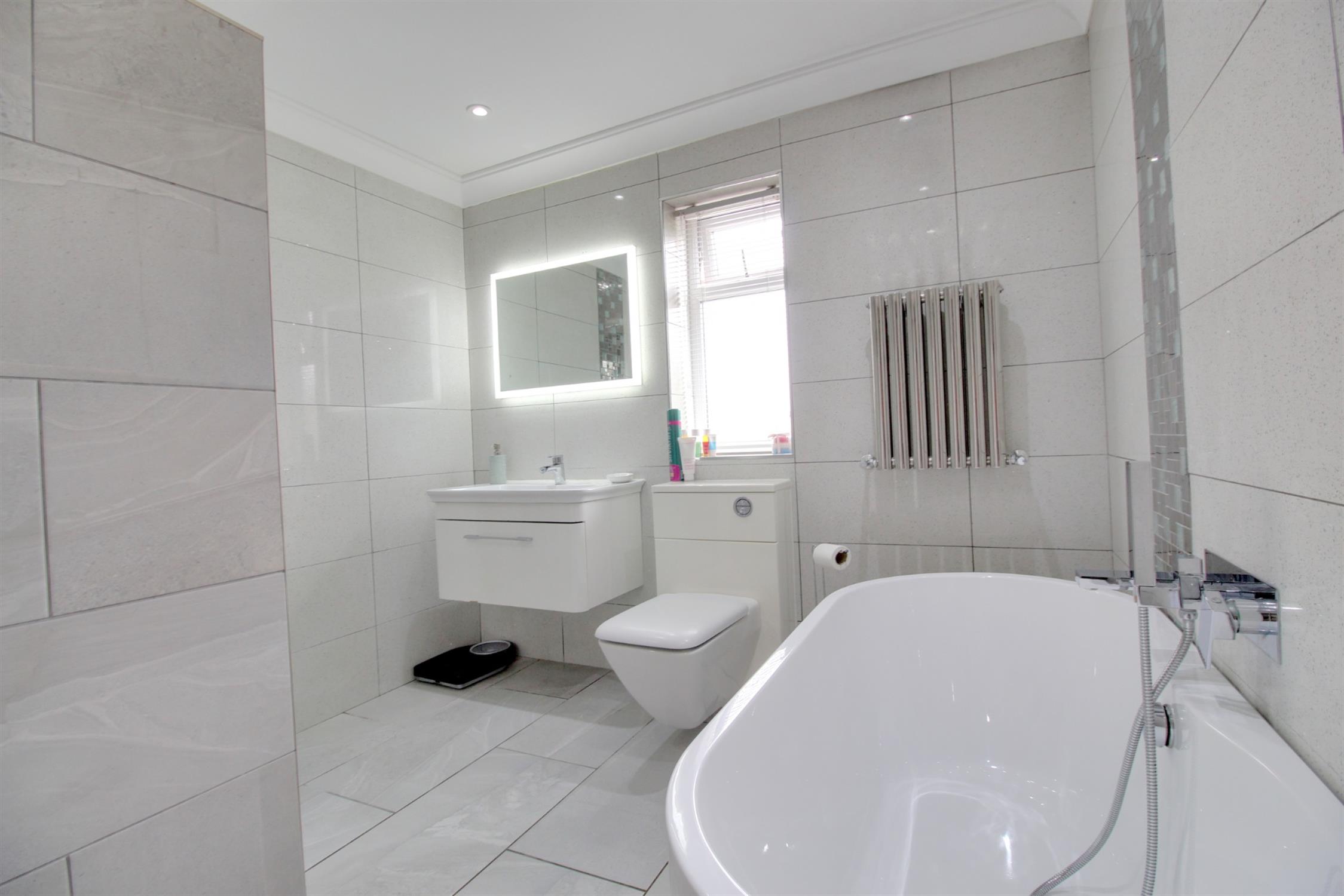 Obscured double glazed window to the side, wall mounted mirror with light, radiator, fully tiled, WC, wash hand basin with vanity unit, walk in double shower and freestanding bath with showerhead.
