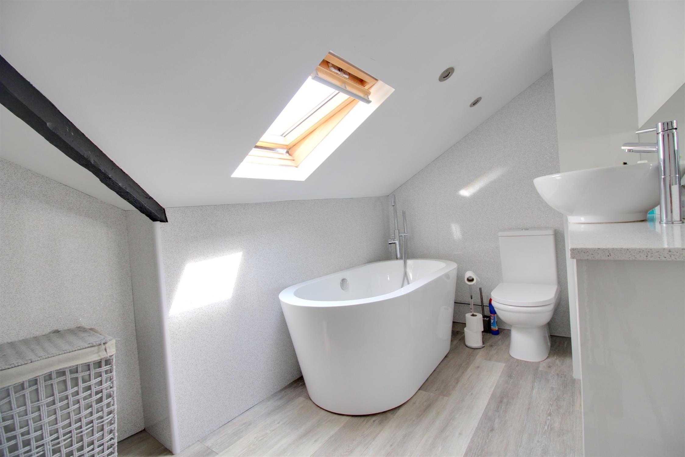 Karndean flooring, Velux style window to the rear, WC, wash hand basin with vanity unit, quartz granite splashback with mirror above, freestanding bath with showerhead attachment.