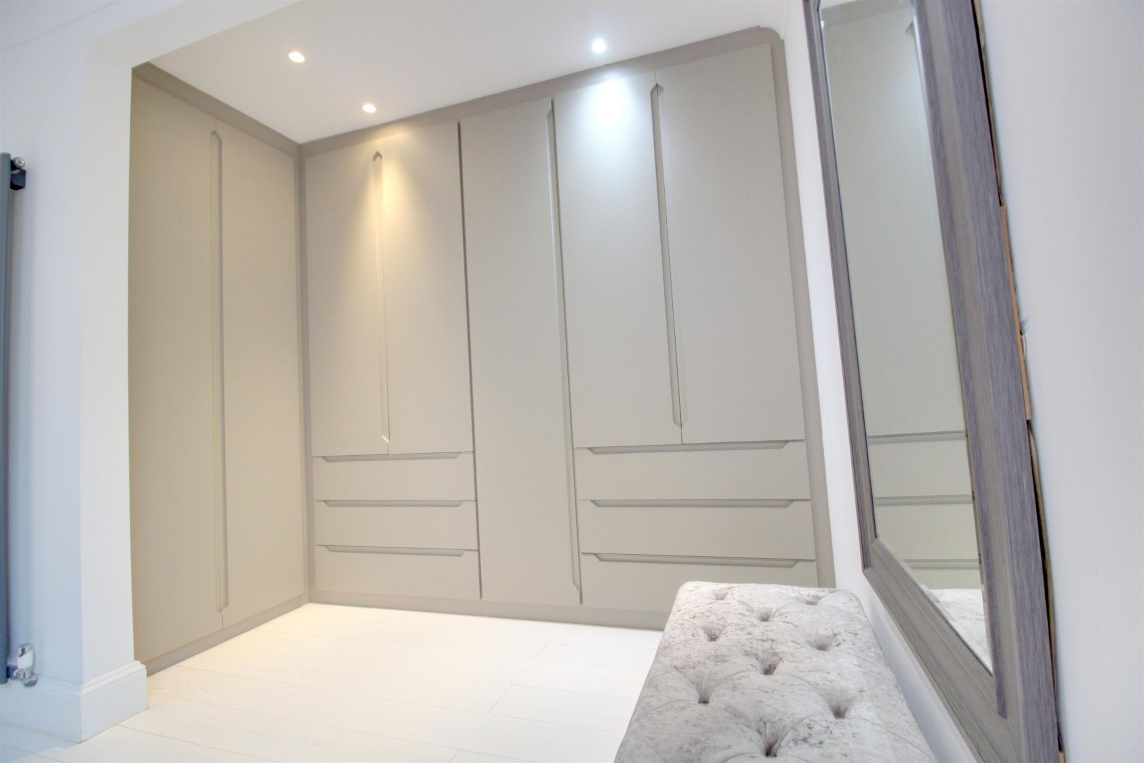 Wooden flooring, obscure double glazed window to the side, radiator and built in wardrobes with handing space and draws.